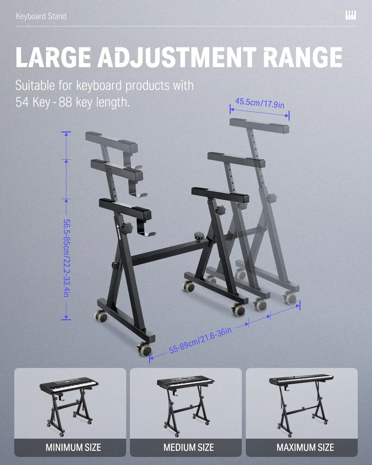 The width of the piano frame can be adjusted from 55cm-89cm (21.6''-36''), and the height adjustment range is 56.5cm-85cm (22.2''-33.4''), whether standing or sitting, it can be adjusted according to your The height and keyboard specifications can be adjusted.