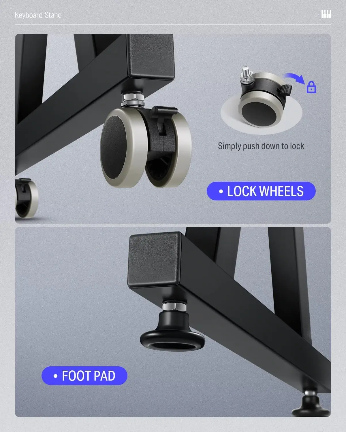 This product includes lockable swivel wheels that allow you to move the stand smoothly anywhere. When you don't need to apply the wheels, you can switch the footpads to fix it. (Note: When using the universal wheel, remember to lock the wheel after the piano is placed on the piano stand.)