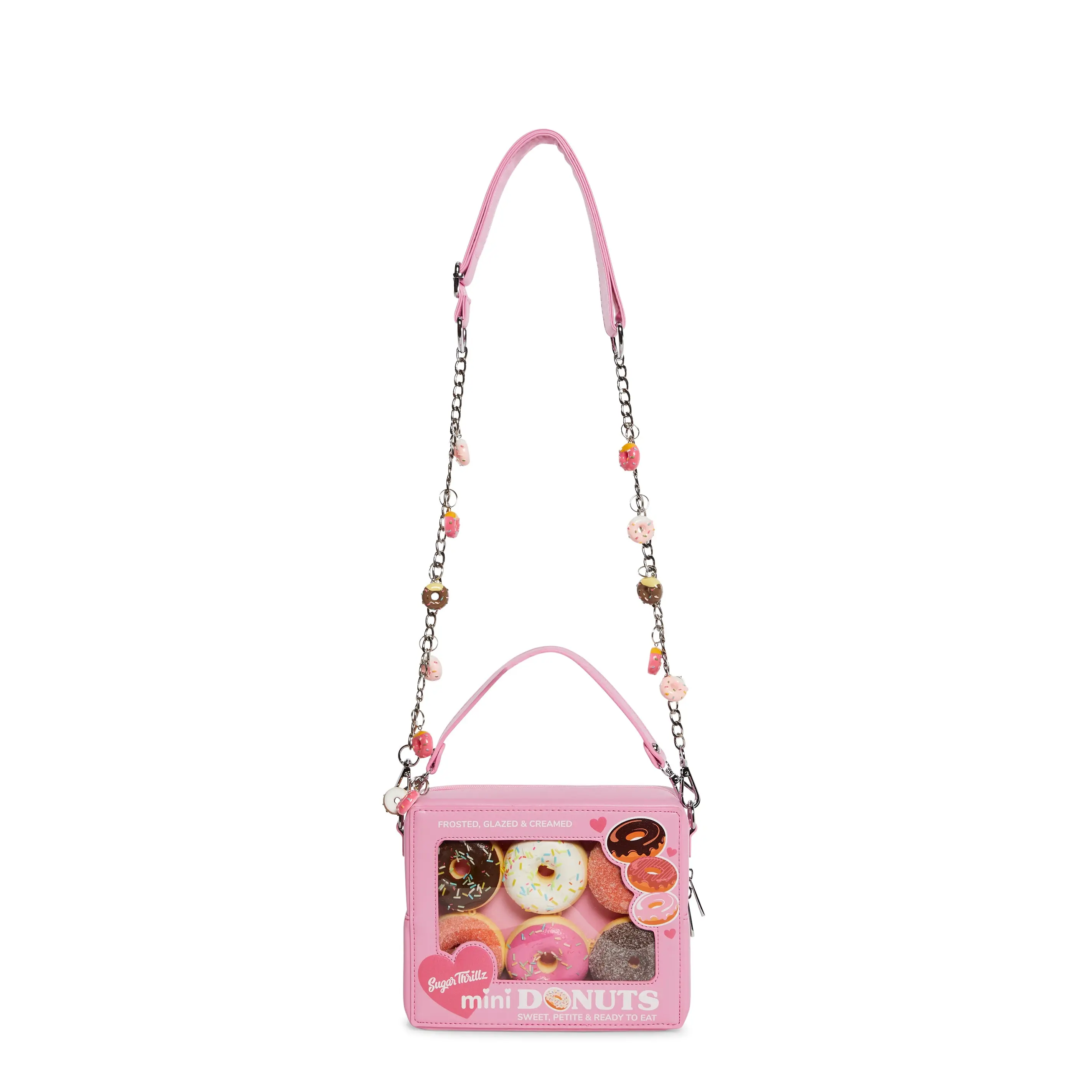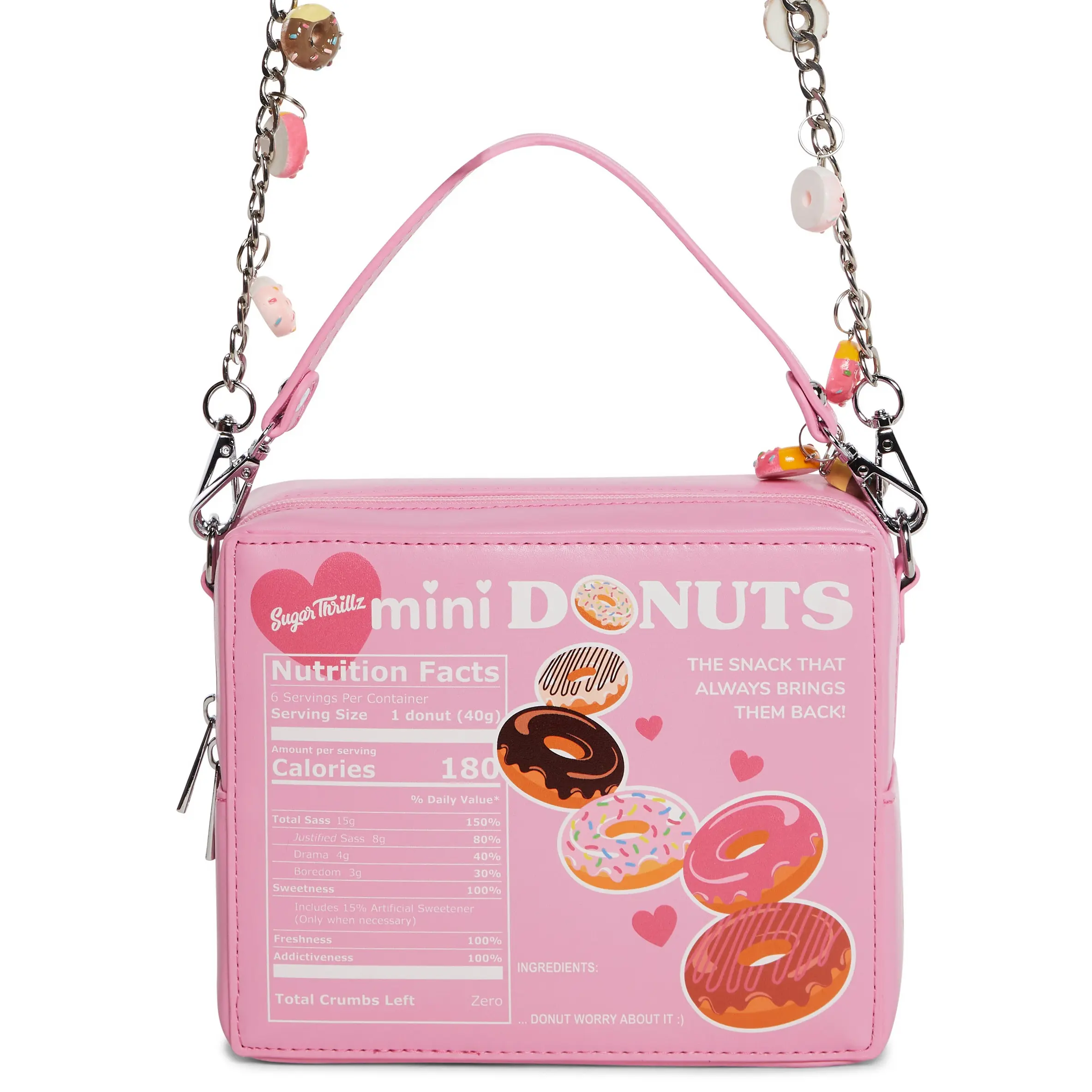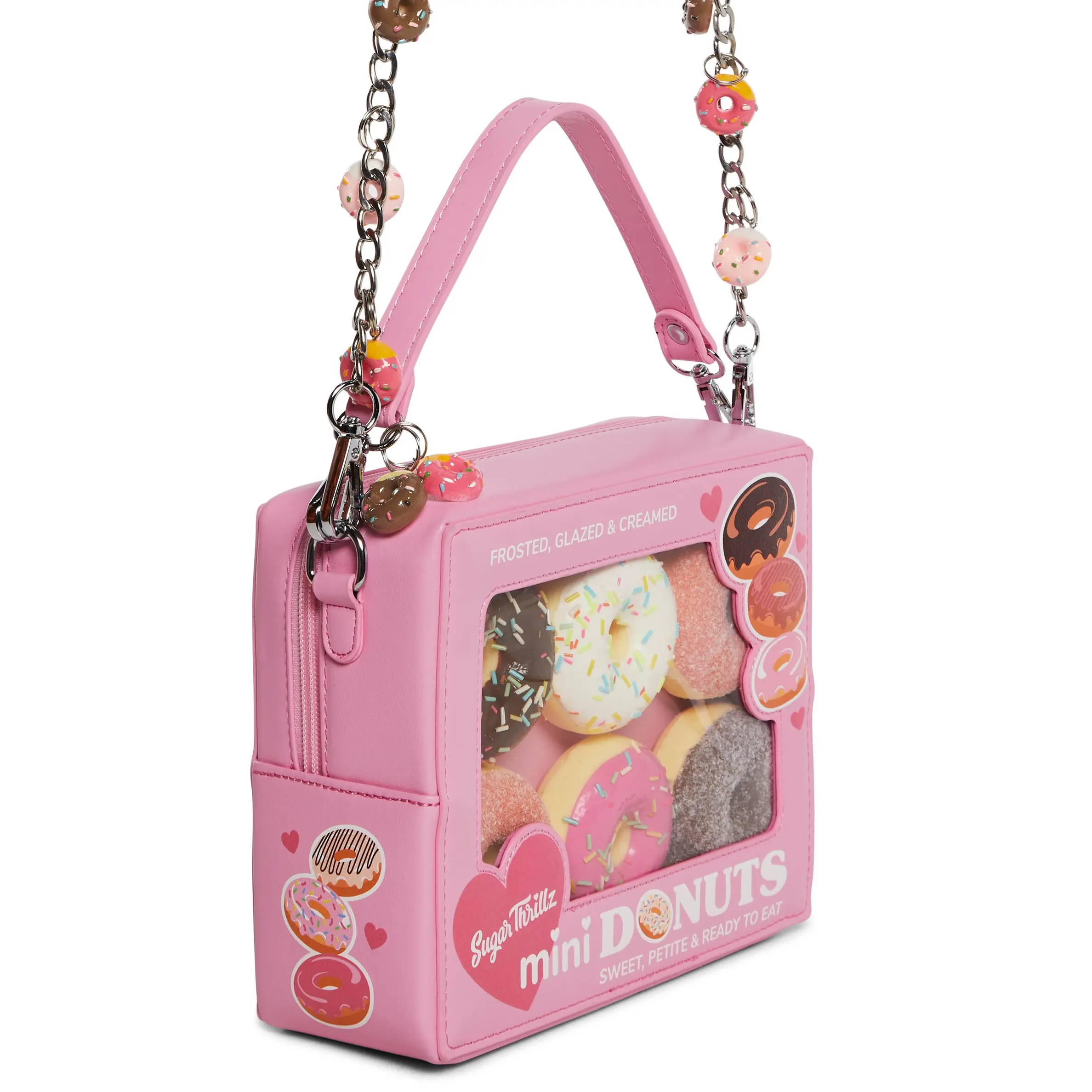 You’re the sweetest treat with this donut box-shaped crossbody bag, featuring a vegan leather and clear vinyl construction, decorative plastic donuts on the front, a removable top handle and chainlink shoulder strap with donut enamel charms, front graphic text reading ‘Frosted, Glazed, and Creamed’ and ‘Sweet, Petite, and Ready To Eat’ alongside the Sugar Thrillz logo, back graphic text listing the nutrition facts, and a top zipper closure.