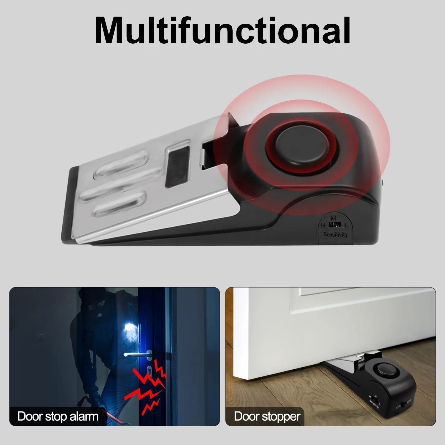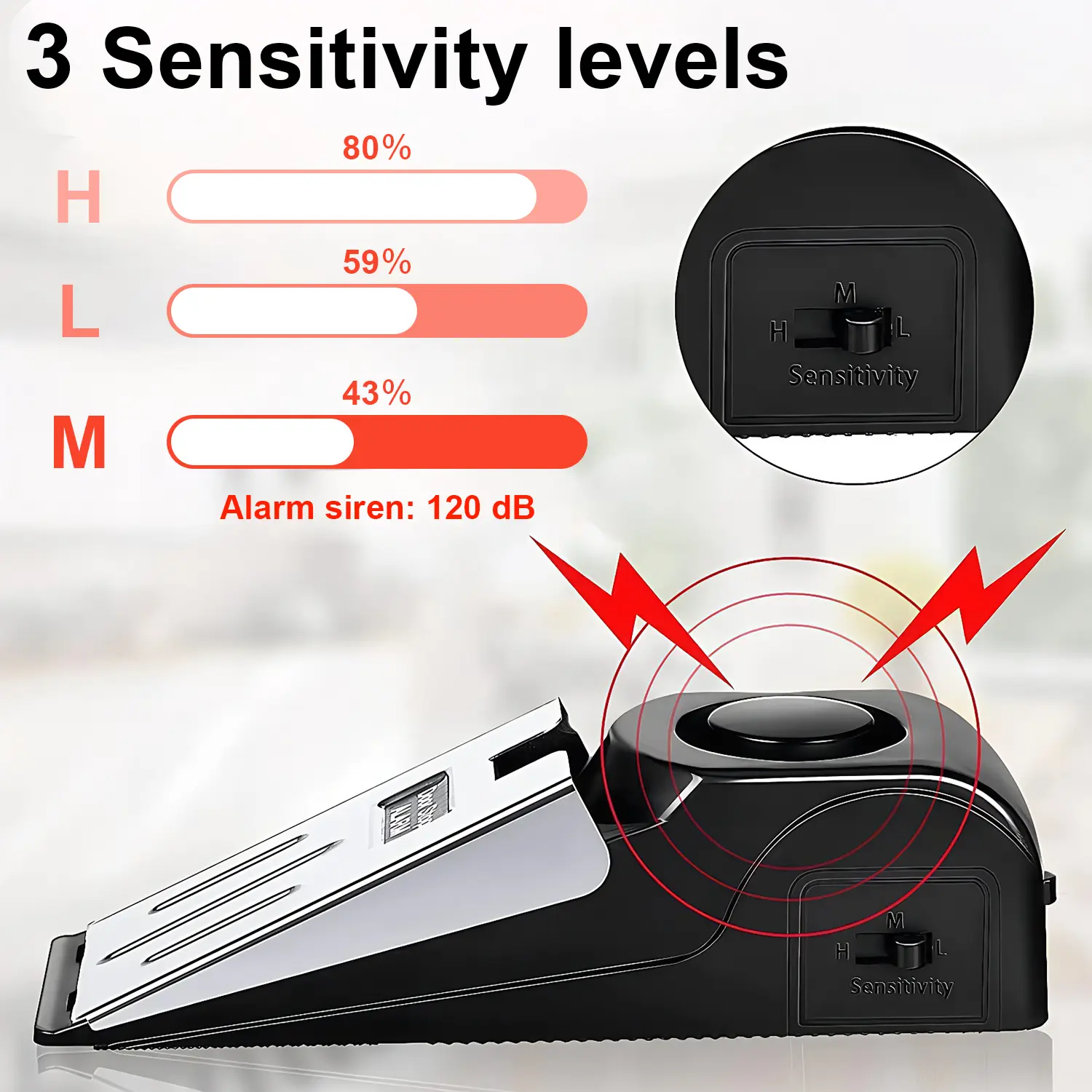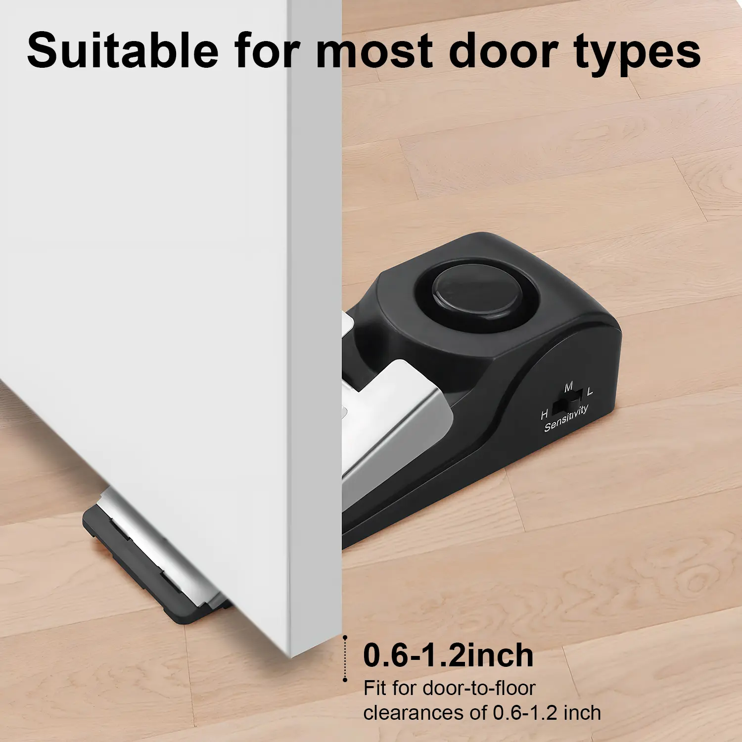【3 Sensitivity Levels】 There are 3 sensitivity levels - low, medium and high - with an adjustable sensitivity switch on the side. The sensitivity of the vibration sensor can be adjusted from low to high to meet your needs. The door stop alarms fit for the gap between the door and the ground be 0.6''-1.2''. Please note when the siren starts to sound small, it is time to change the 9V with a new one.