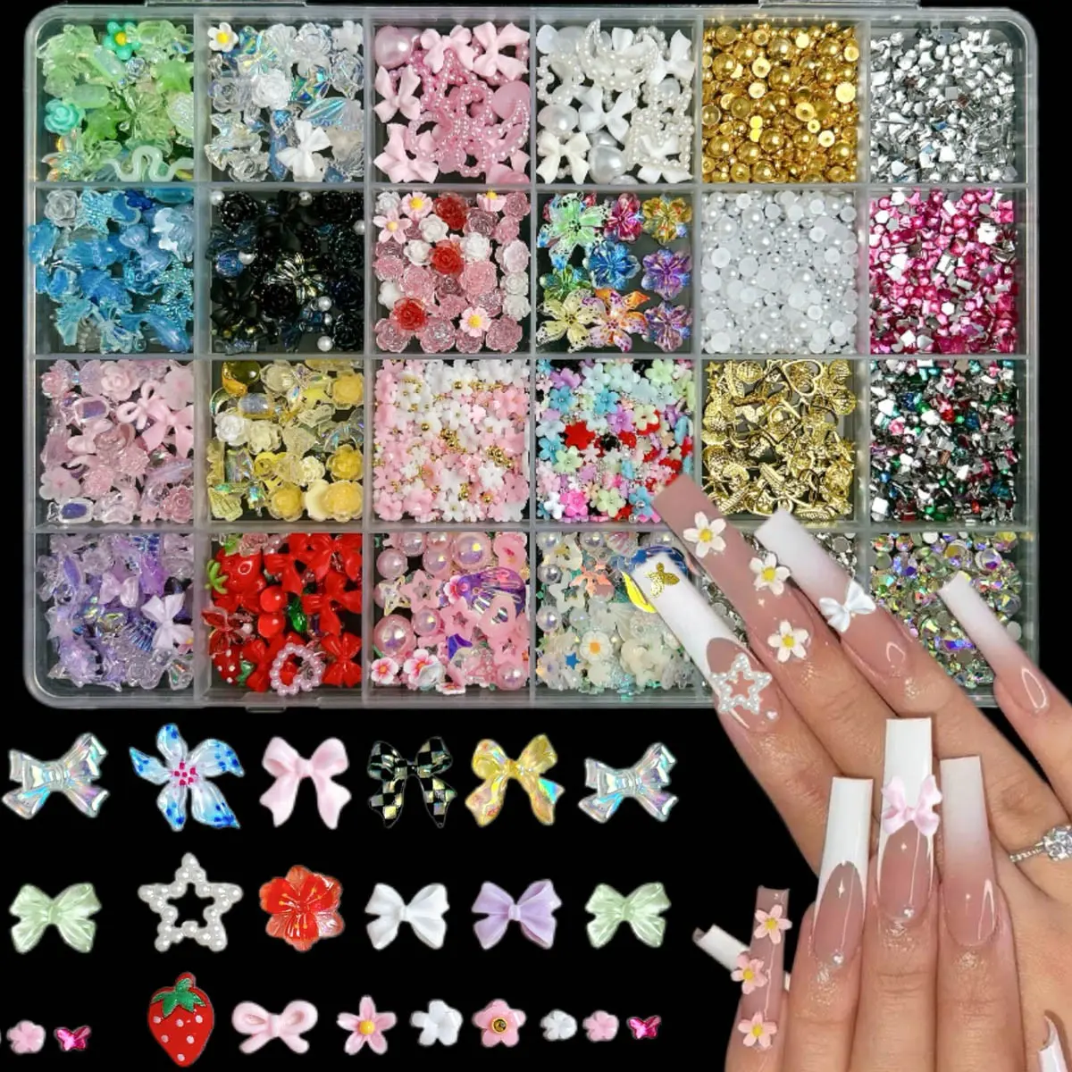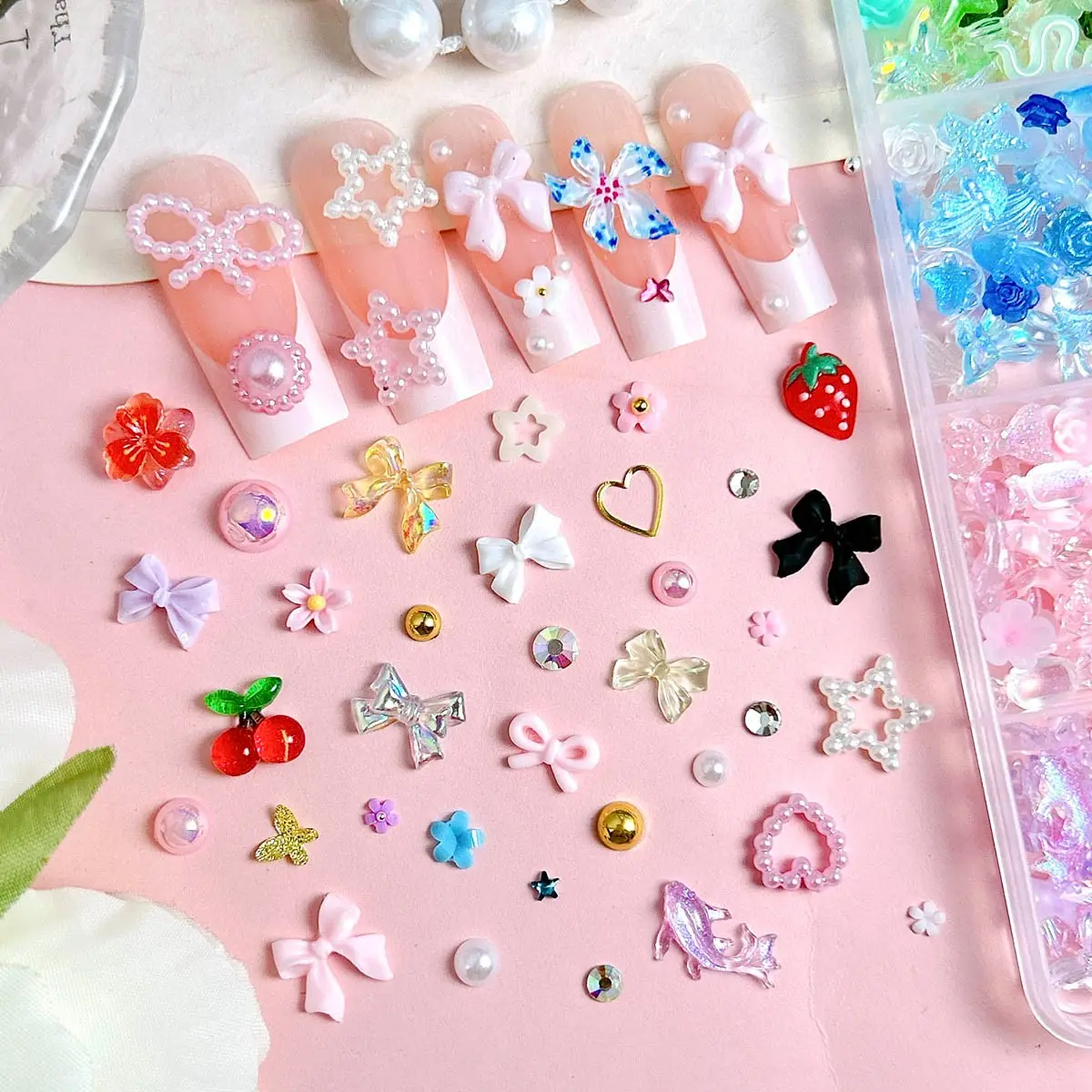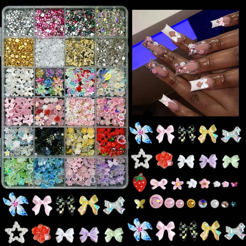 4. 1Box Dopamine Colored Resin Flower Bow Nail Charms Semi-circular Rhinestones Pearl Mini Shell Feather Flakes Mixed Nail Decor DIY Elegant Rhinestone Decorated