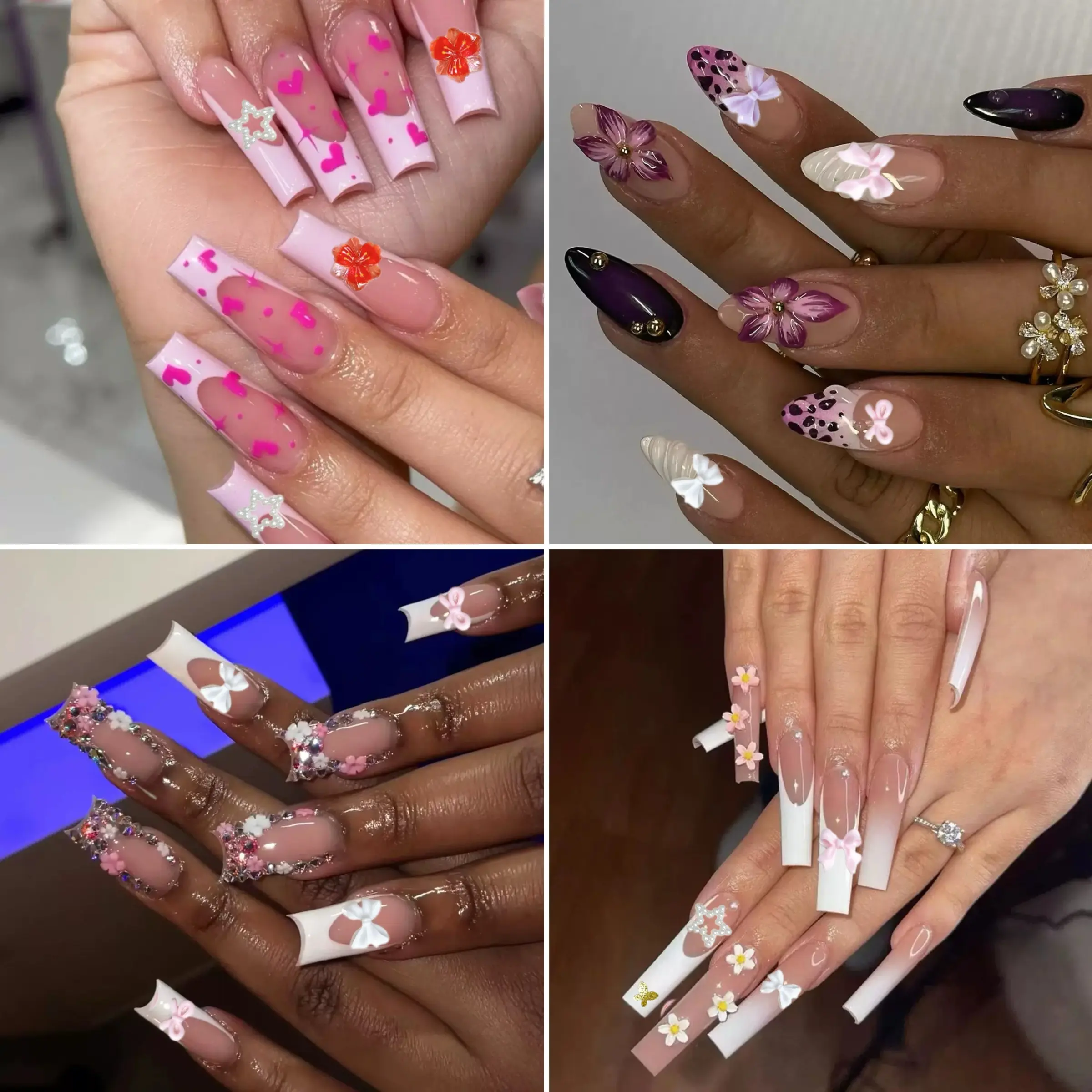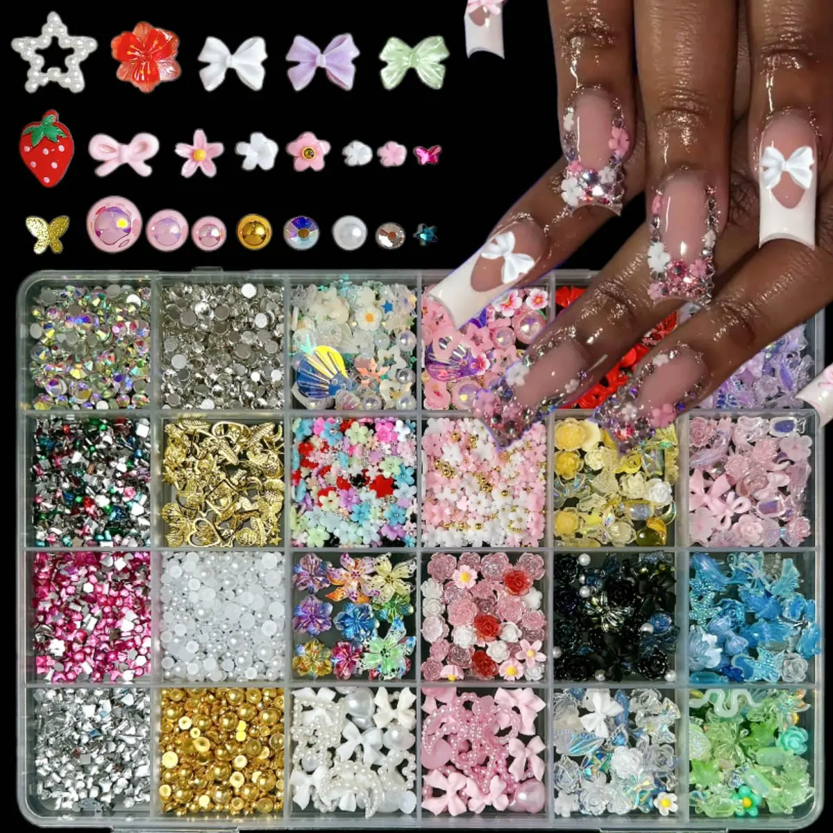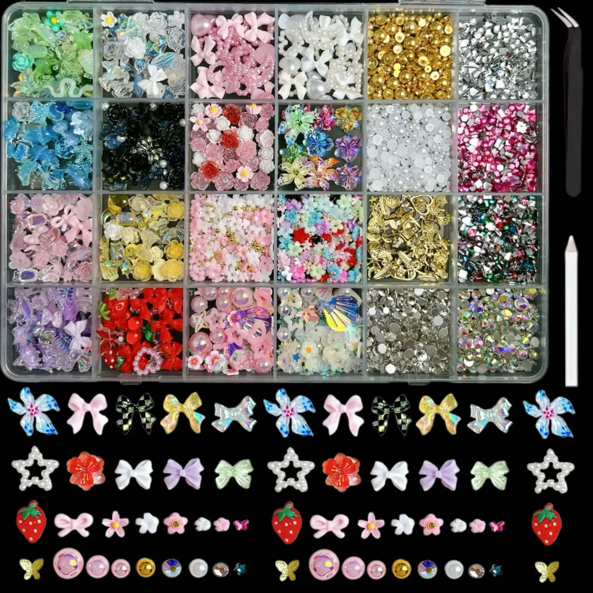 4. 1Box Dopamine Colored Resin Flower Bow Nail Charms Semi-circular Rhinestones Pearl Mini Shell Feather Flakes Mixed Nail Decor DIY Elegant Rhinestone Decorated