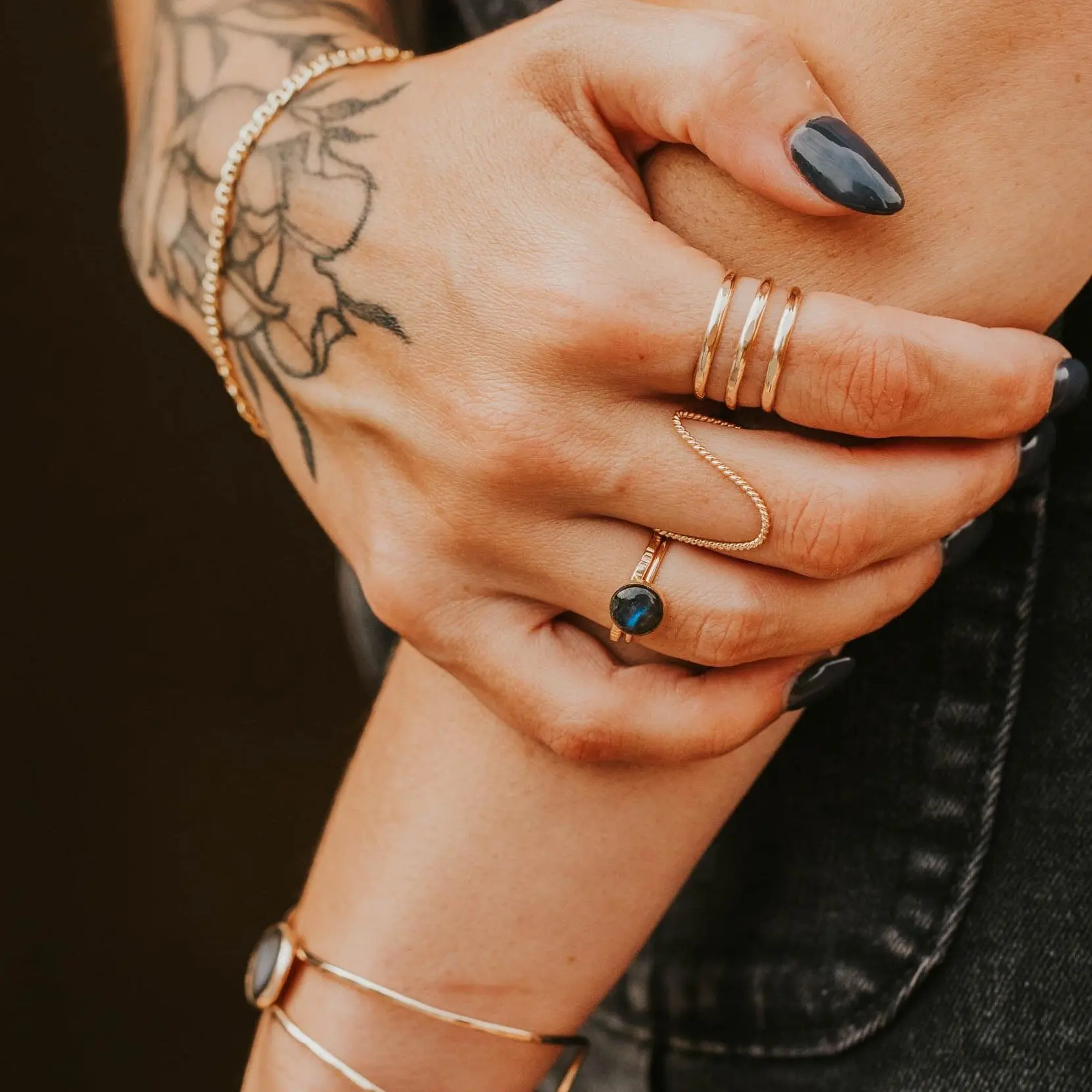 Hard to describe. In indoor light, it’s dark, with a slight blue shimmer. In day or sun light, it lightens up and you can see tiny gold flecks. Holds its own as a solo ring, but complements a stack, too.