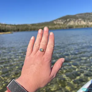 Love this ring— dainty and beautiful! It takes on different coloring depending on the lighting, which is fun!