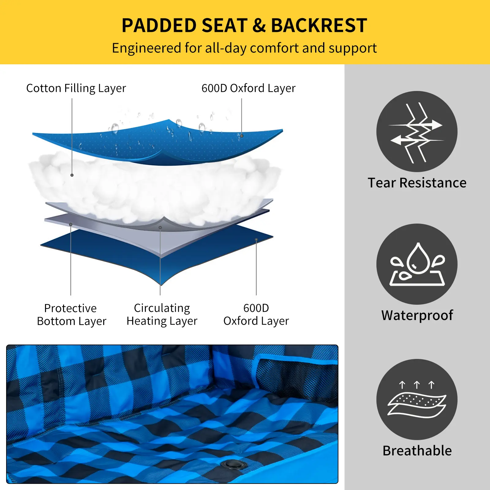 ·Dual-Seat Heating: Independent 3-level heat zones (104°F–149°F) for both seat & backrest.