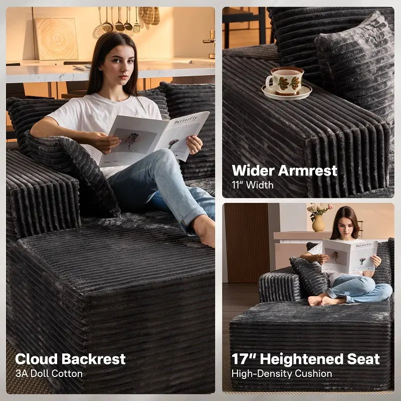 Transform your living room with this Double Chaise Lounge. It features plush corduroy upholstery for a modern, fluffy look. This oversized sectional couch doubles as a sofa bed, perfect for guests. The design includes a no assembly sleeper lovet seat, ensuring convenience. Ideal for living rooms or audiovisual rooms, it offers versatile seating options.