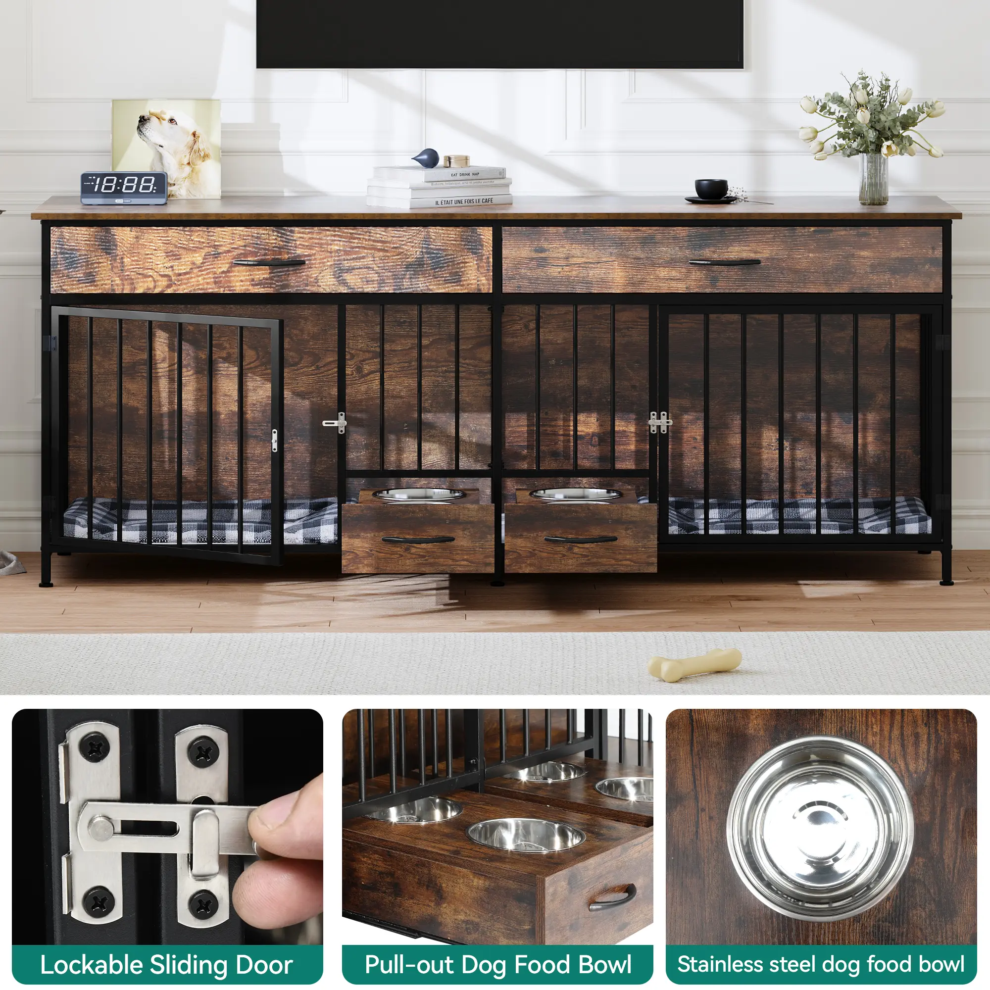 Dog Crate with Feeder Bowls: Our wooden dog kennel comes with 4 stainless steel dog food basins that can be pulled out from the outside to deliver dog food and water into the kennel, saving space and allowing your dog to be fed without opening the door; Can also pull it for outside use
