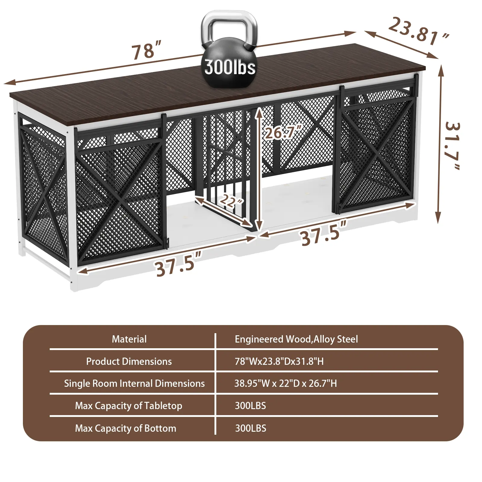 【Spacious】Size: 78"W x 23.8"D x 31.8"H. Each side: 38.95"W x 22"D x 26.7"H. Great for 2 medium/large dogs. Measure before purchase.
