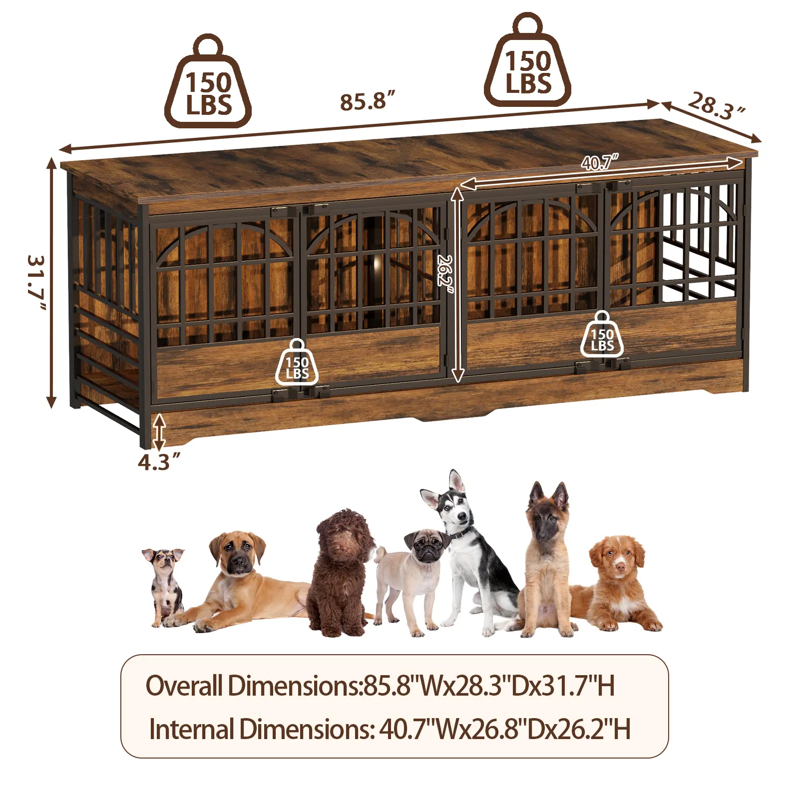 COZPAW 86 Inch Double Dog Crate Furniture for 2 Dogs, Decorative Dog Kennel Indoor TV Stand, Heavy Duty Wooden Dog Cage for Large Medium Dogs Sized Dog Pet House with Divider (Brown)