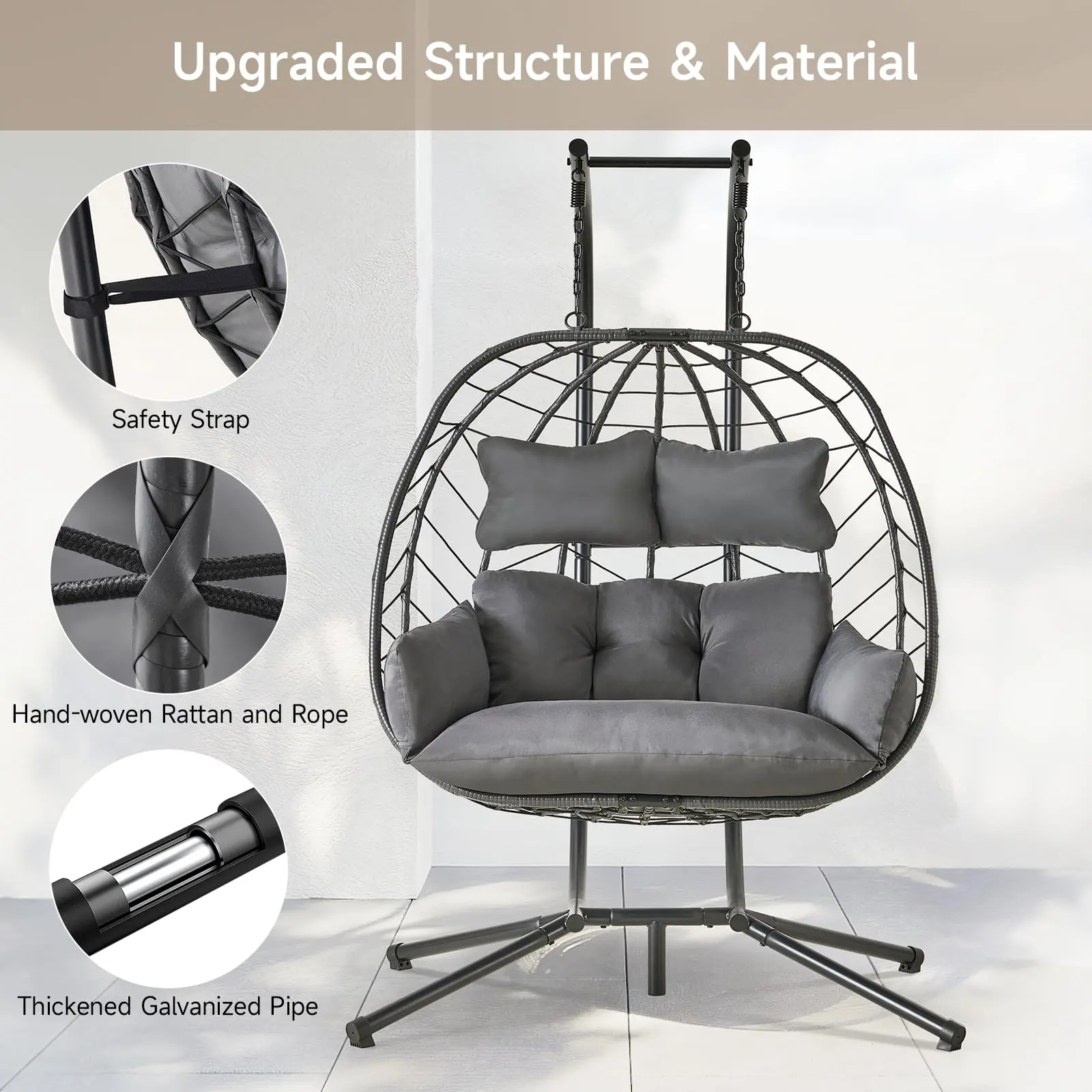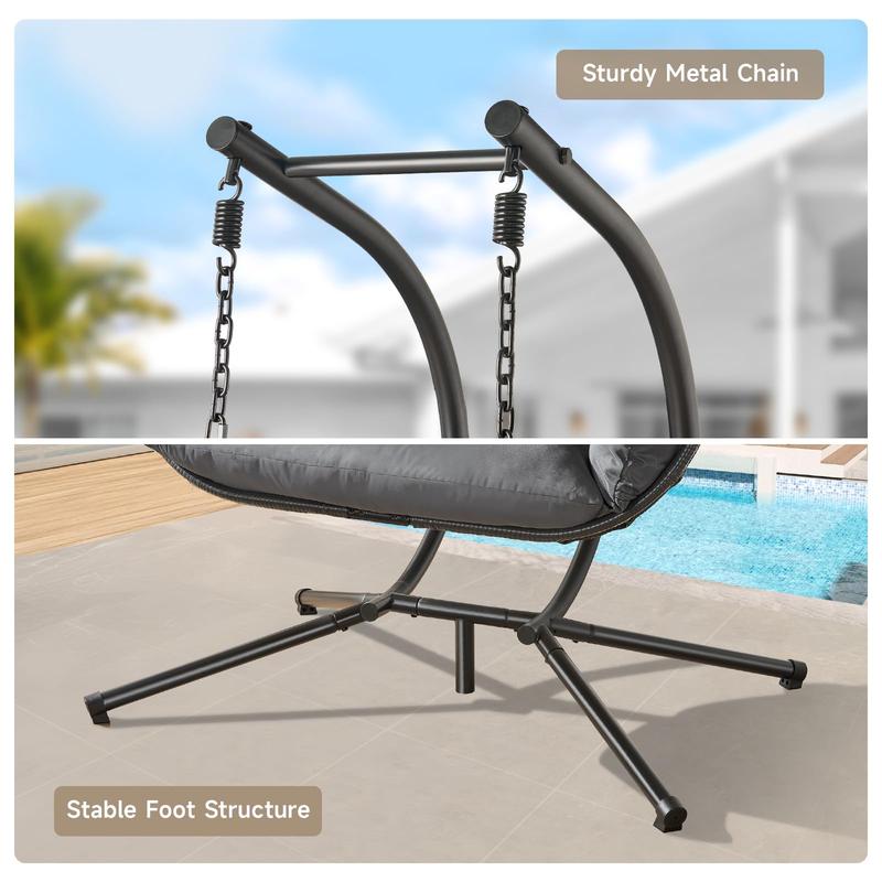 ·Weatherproof Material for Durability: Enjoy your hanging egg chair rain or shine! Crafted from durable, weather-resistant PE rattan and a sturdy powder-coated steel frame, this swing chair won't fade from sunlight, be damaged by rain, or rust or rot
