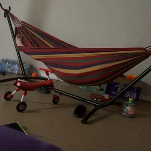 ·Double Hammock: This hammock featuring a sturdy steel stand designed for robustness the hook with metal buckle. 450-pound weight capacity easily accommodates up to two people at once.