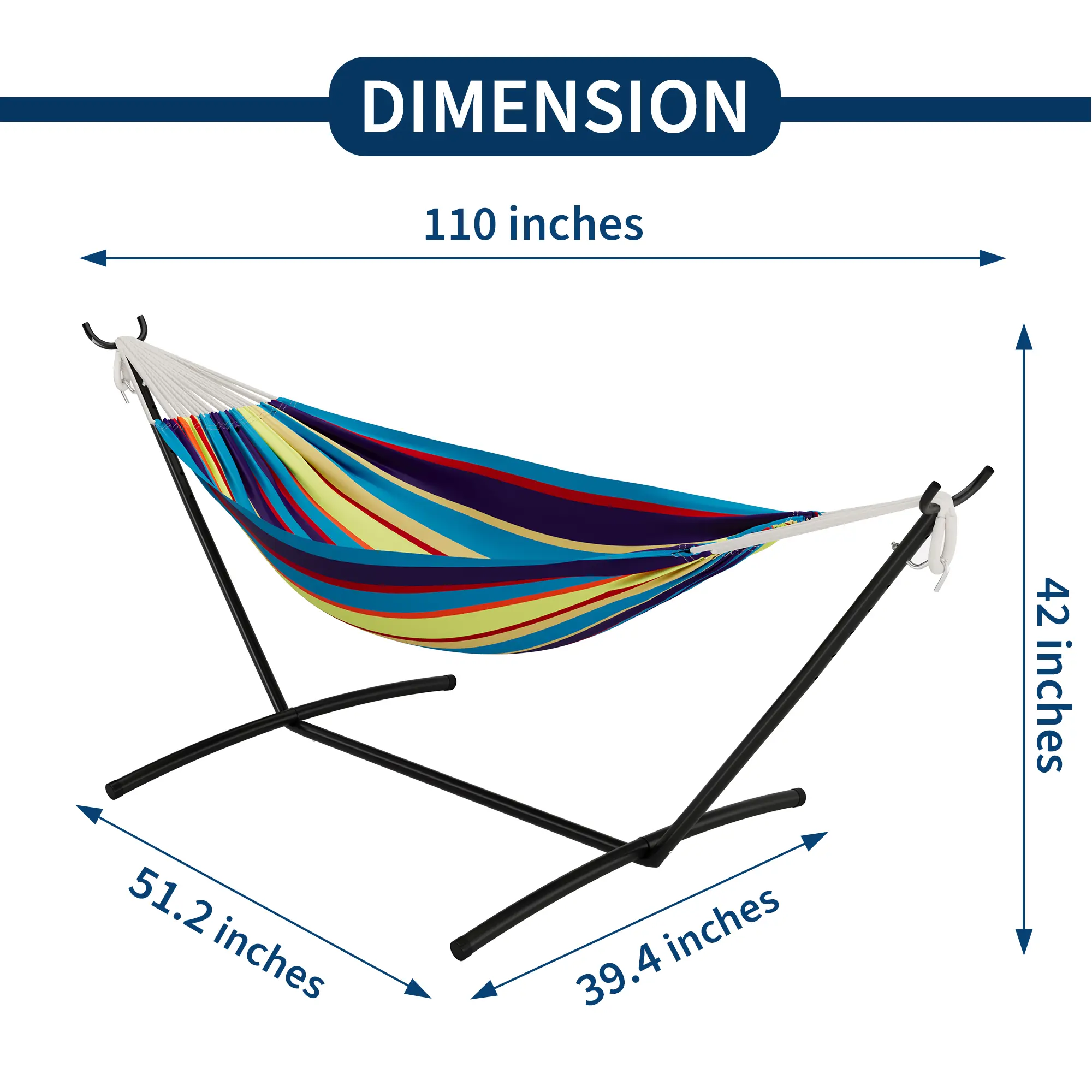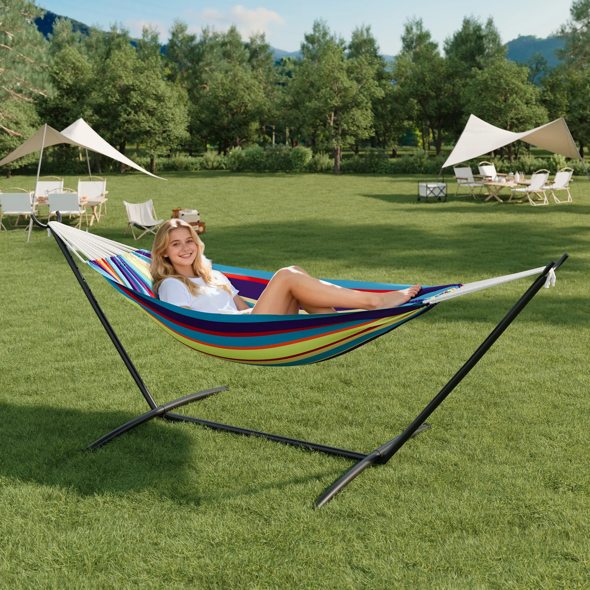 ·1.Vibrant Tropical Retreat: Bring Brazilian beach vibes to your backyard with this eye-catching hammock featuring bold color stripes and a sleek black steel stand. The cheerful design instantly transforms any outdoor space into a vacation-worthy oasis.