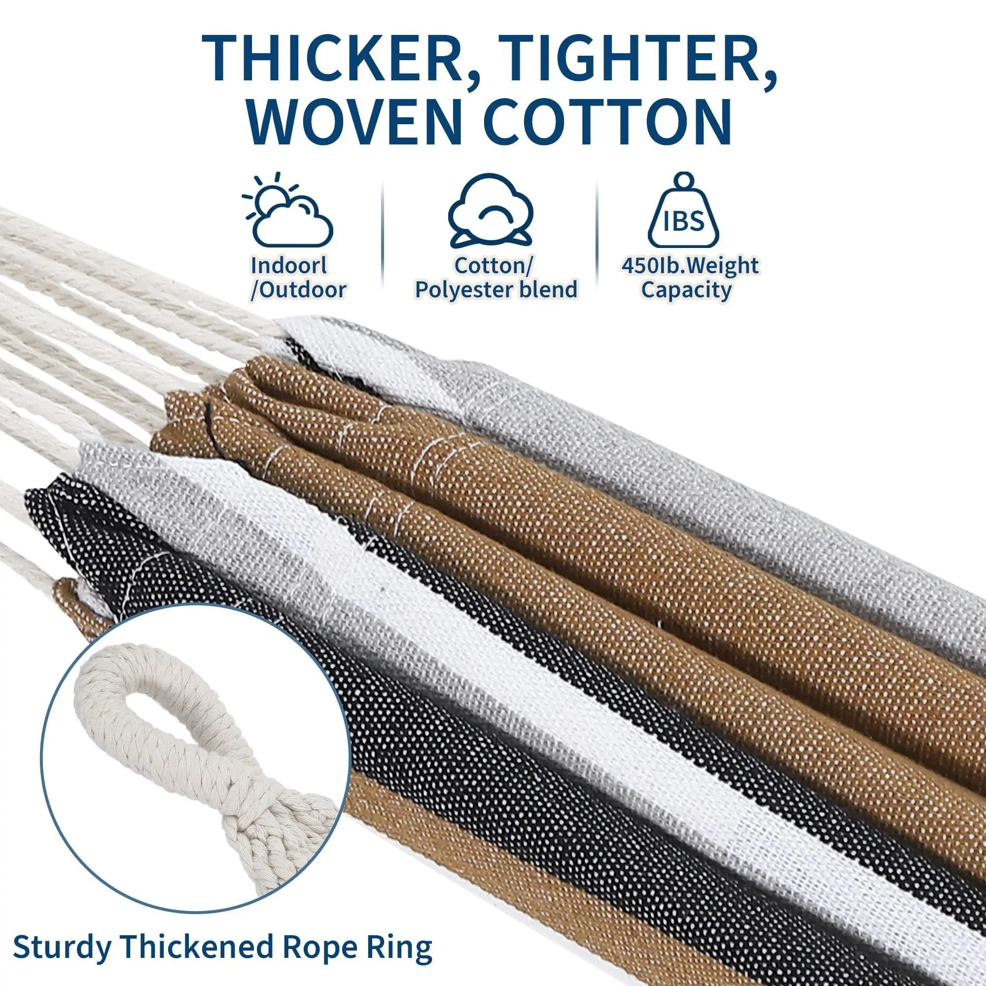 ULTIMATE COMFORT & SUPPORT: Experience gravity-free relaxation. Our hammock is woven from thicker, tighter cotton fabric that cradles your body, evenly distributing weight for zero-pressure-point comfort while the sides gently wrap around you