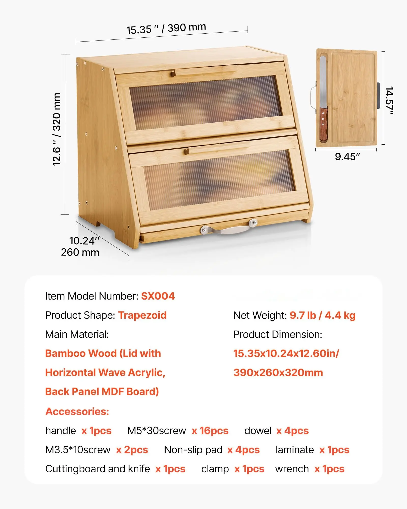 ·Bread Preparation Tools: With a double-layer large capacity, this bread box can hold various types of bread. It comes with a large cutting board and stainless steel bread knife, so you can easily find your tools when you need them