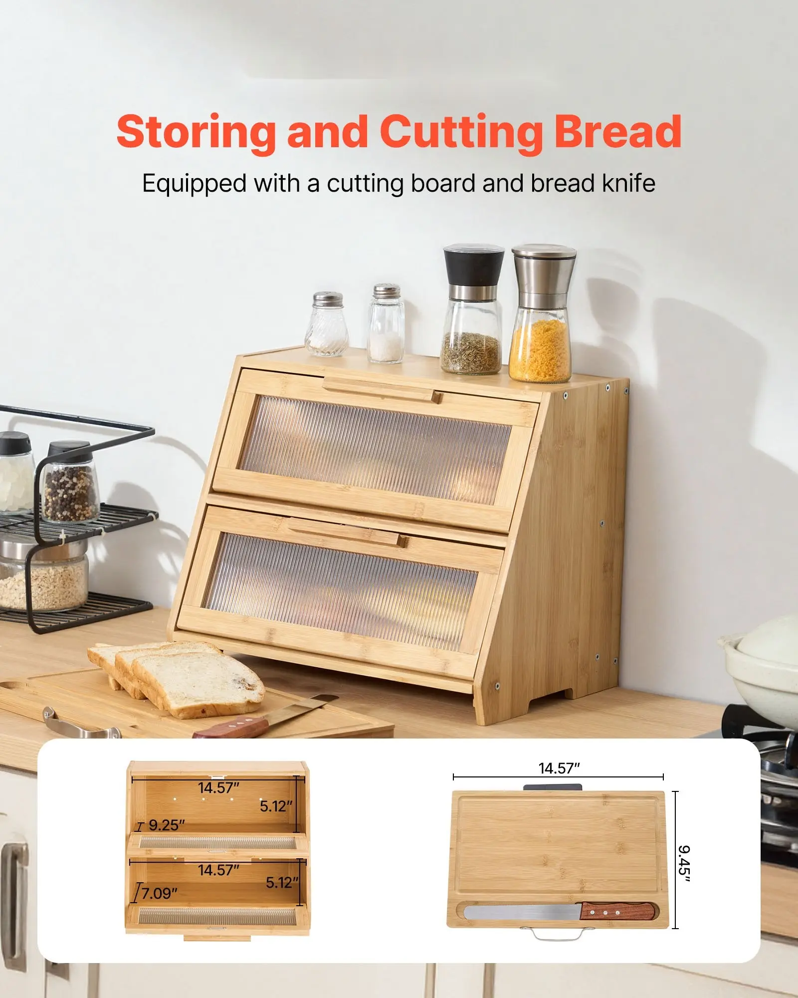 Every item on each tier is clearly visible and easy to find. Our farmhouse bread box also comes with a cutting board and bread knife, so there's no need to search for tools when cutting bread.