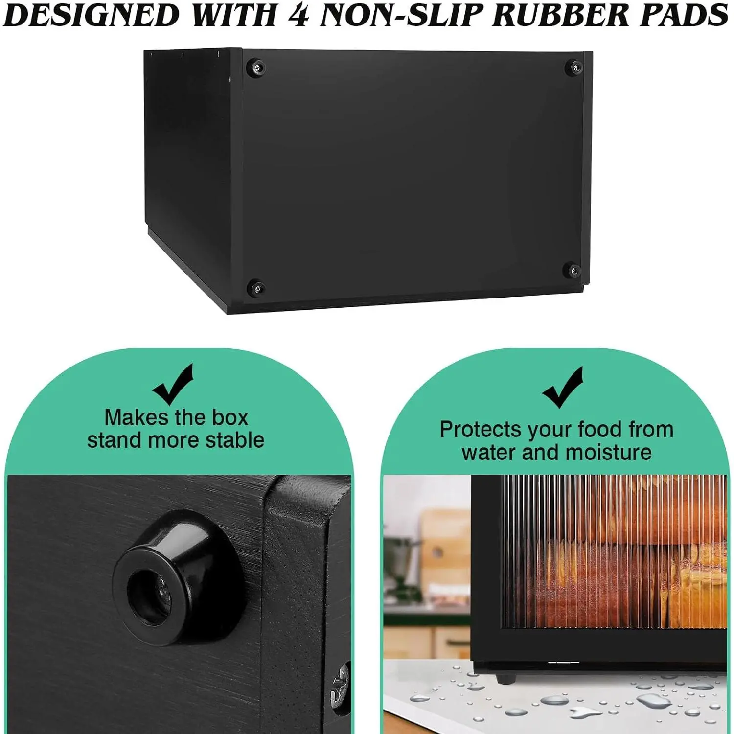[Equipped with Non-slip pads]The bread storage container is equipped with 4 non-slip pads, which keeps it from moving around, so it can stay stable.With feet on, the bottom panel stays some distance from the countertop, it helps keep the box away from water and moisture.