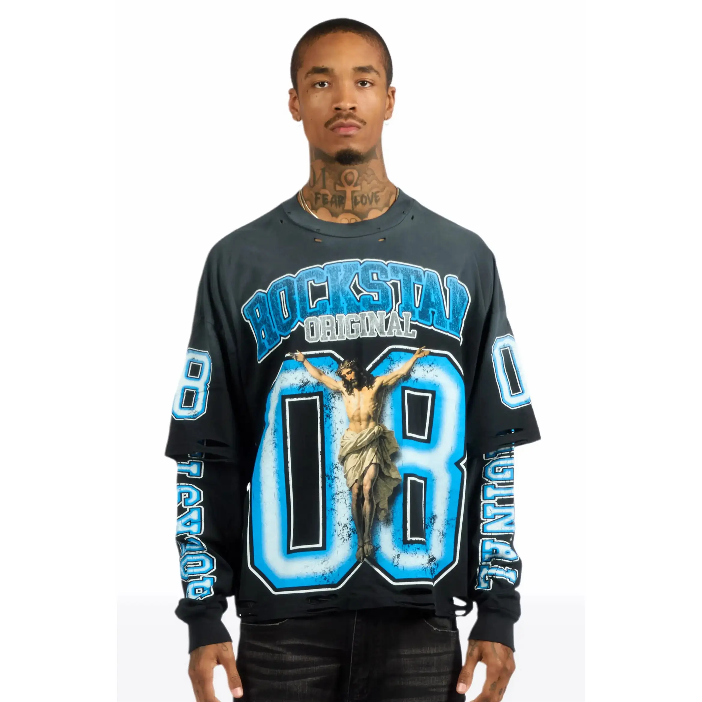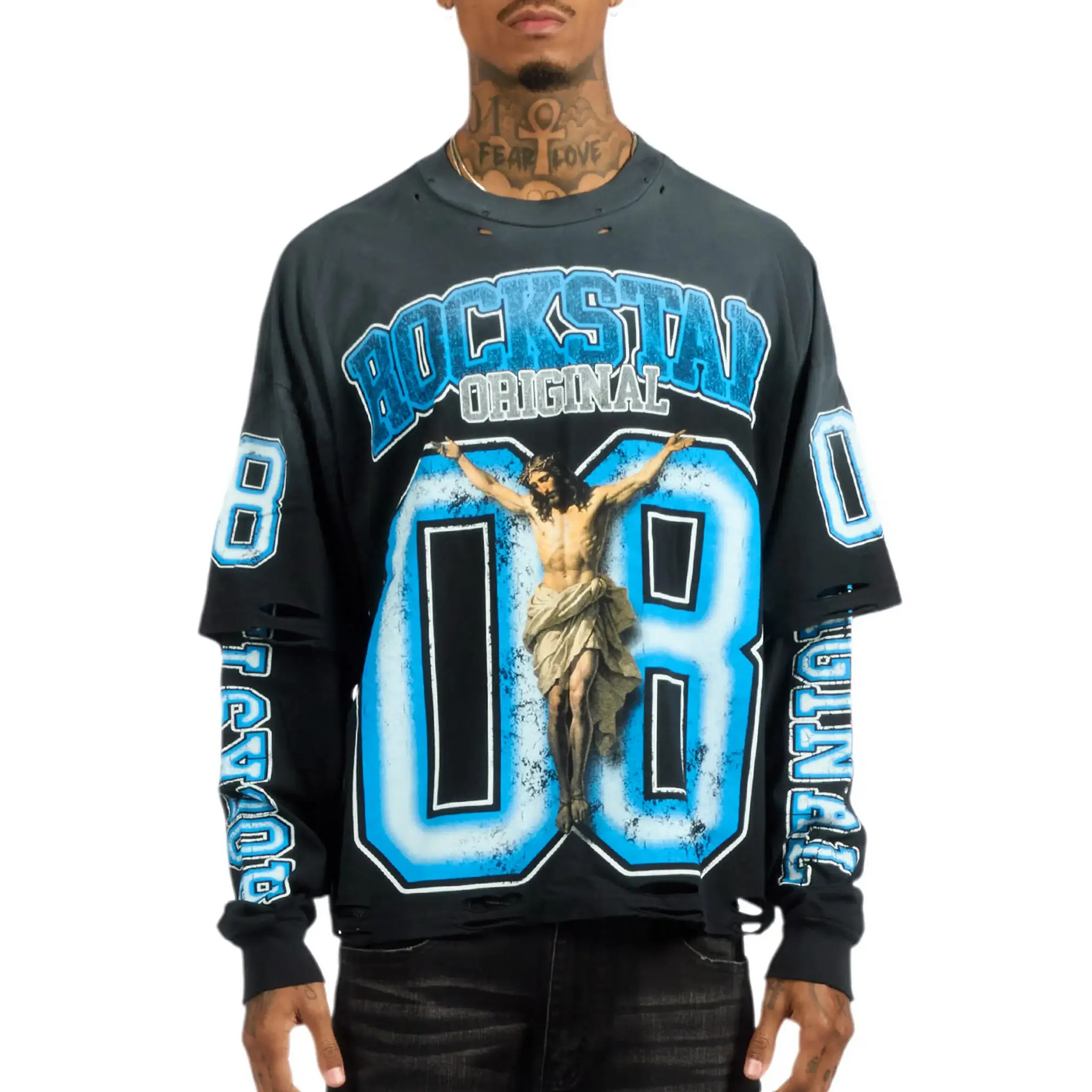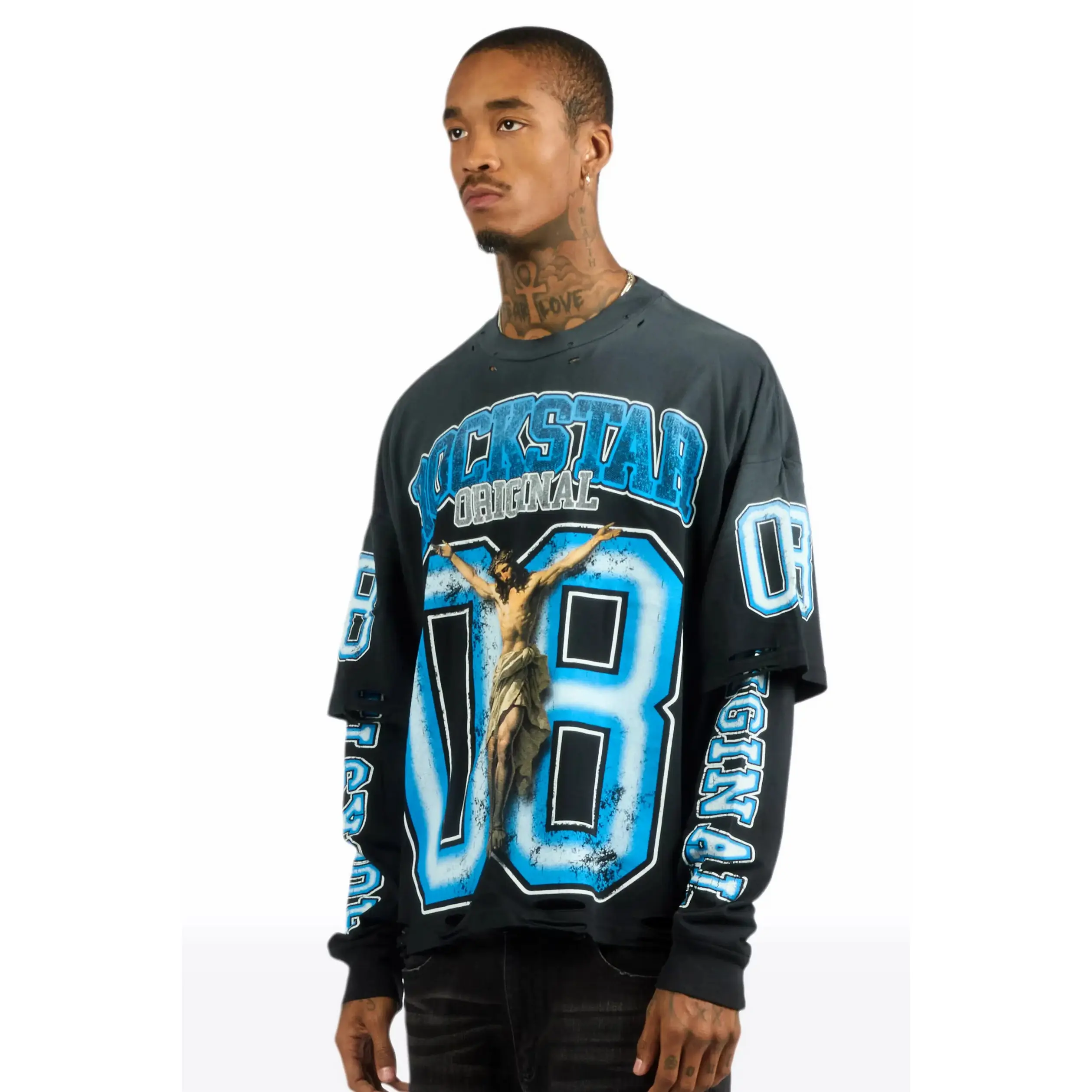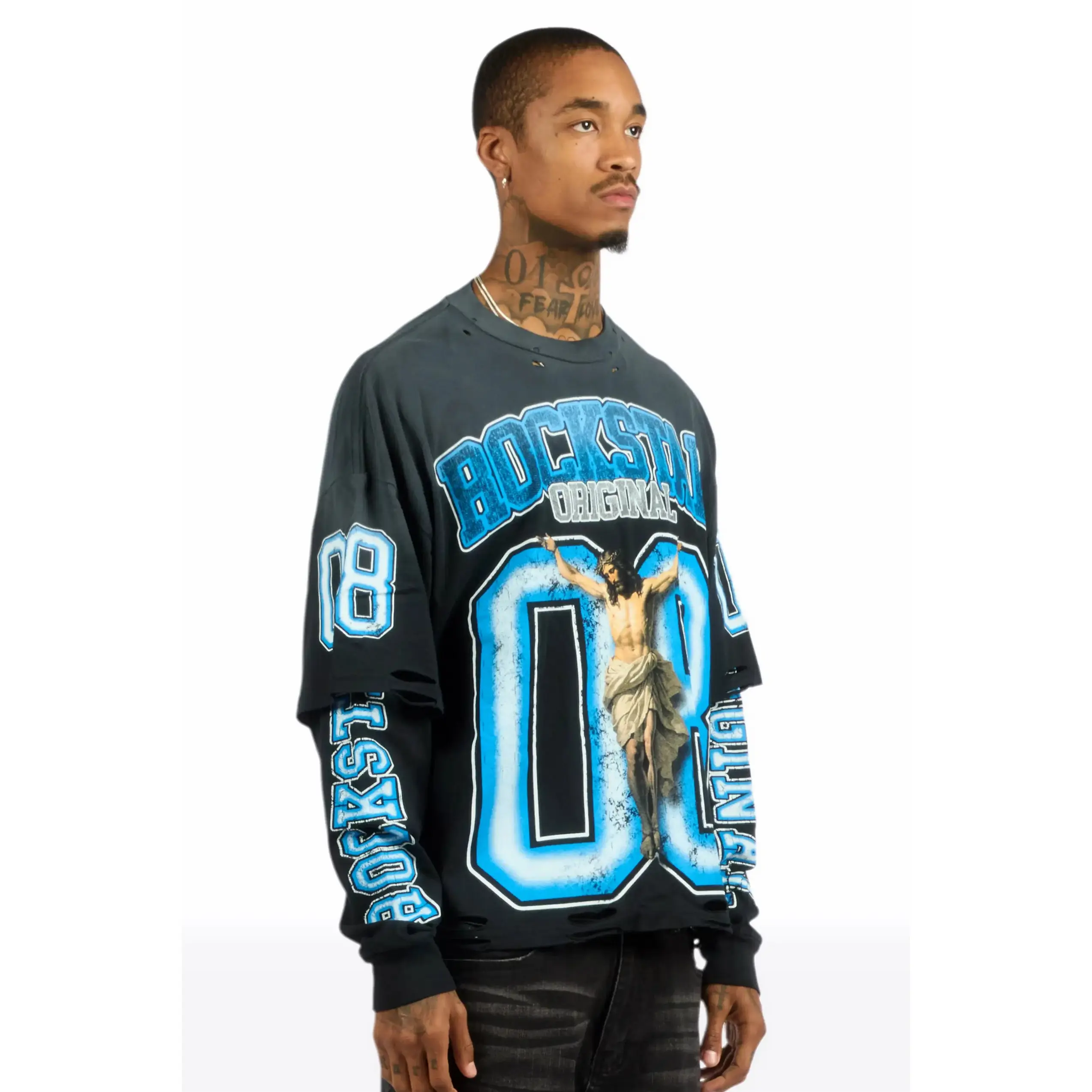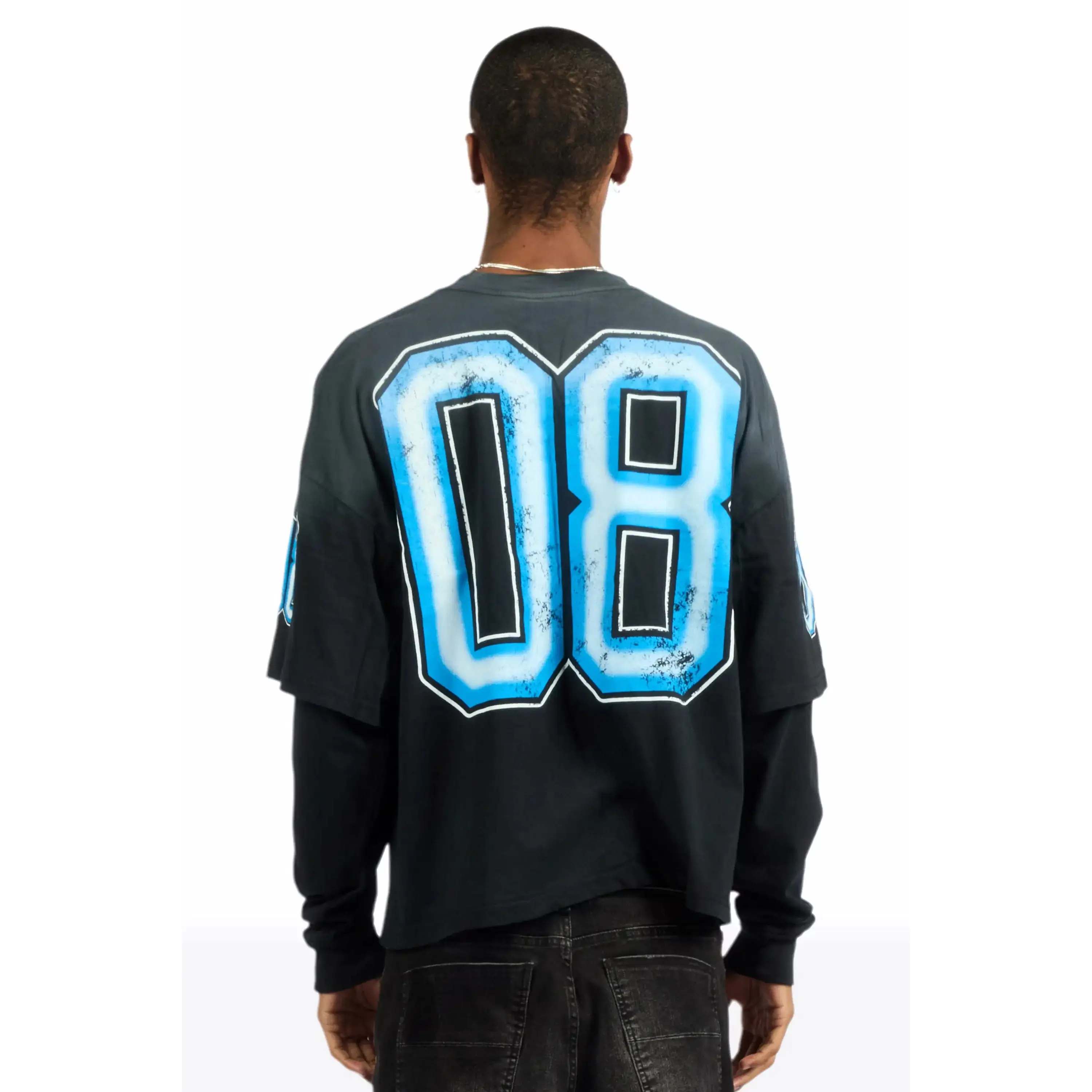 An urban streetwear Double Layer long sleeve tee for men in black. Designed with a worn-in wash and custom detailing for a must-cop staple piece tee.