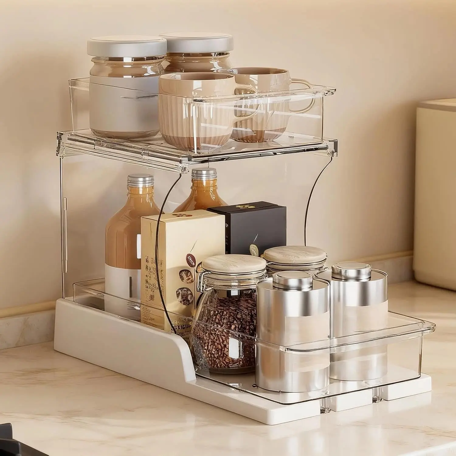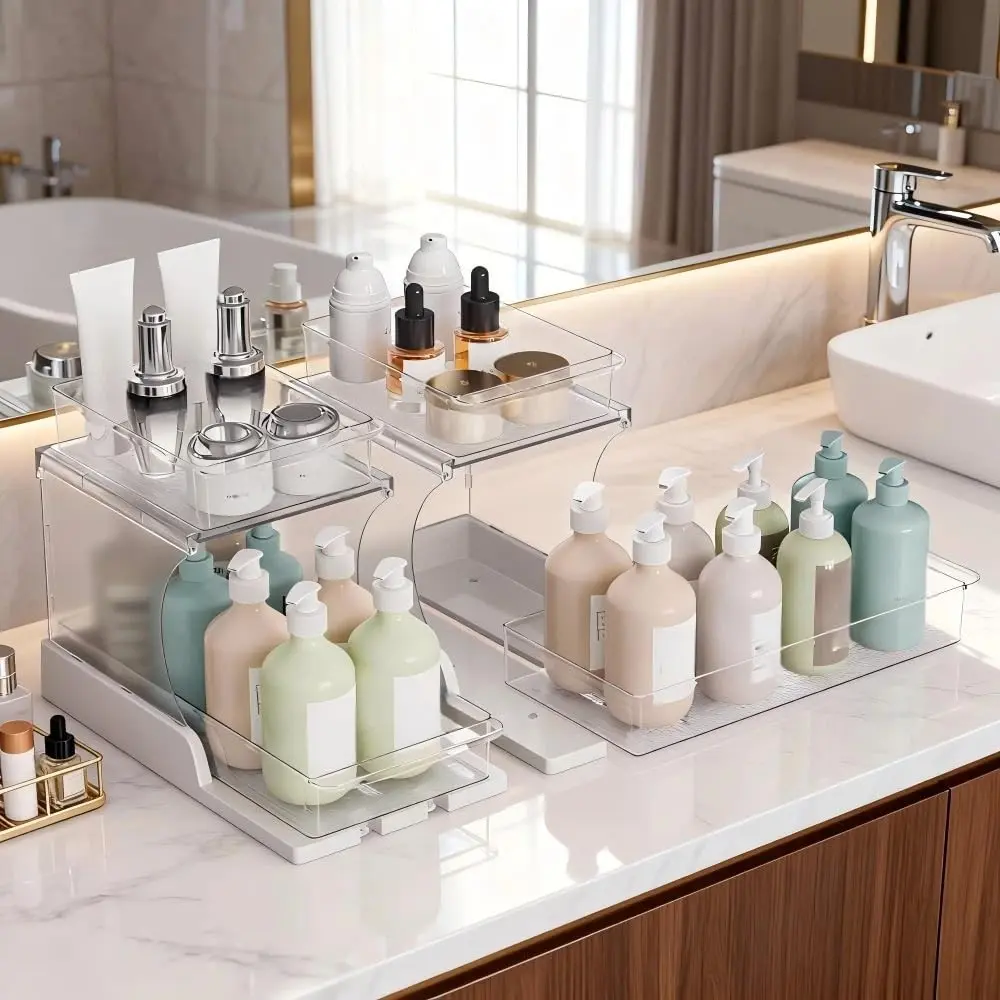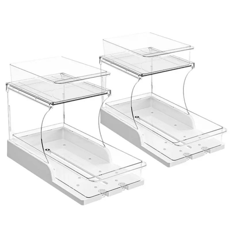Double Layer Pull-Out Cabinet Organizer, Rotating Sliding Drawer Storage Rack, Kitchen and Bathroom Use, Under Cabinet Storage Shelf
