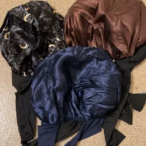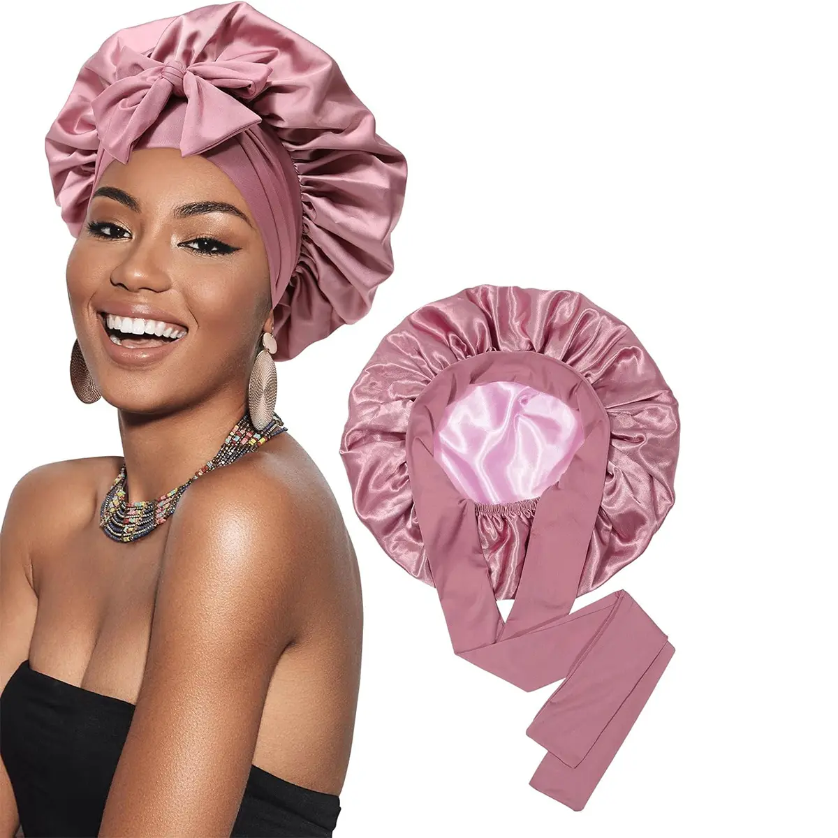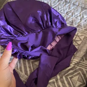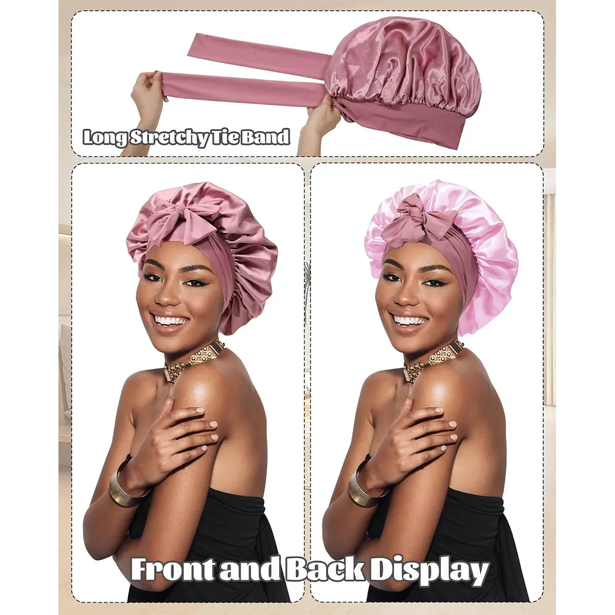 wide elastic band at the bottom of the satin sleep bonnet, which can be stretched to fit different head sizes. At the same time, there are 2 long enough elastic straps, which can effectively adjust the size of the head.