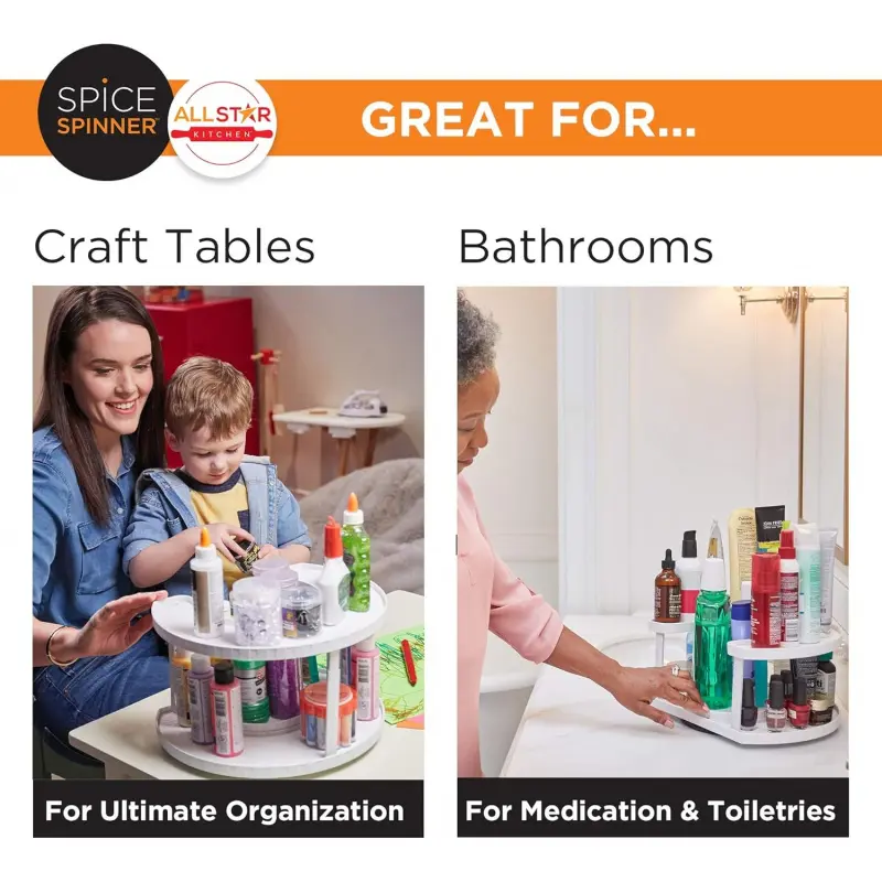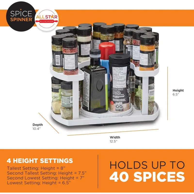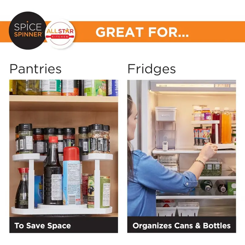 The rotating spice rack is an adjustable, double-layered spice organizer that can store and stack all your spices, helping you save space and keep everything organized! With its unique D-shaped design, the rotating spice rack fits snugly into any cabinet, refrigerator, or pantry! Just a gentle twist and the spices will be within reach, giving you an instant overview. The maximum load capacity is 15 pounds, with the top shelf holding up to 5 pounds. Overloading the top shelf may cause the rotating spice rack to tip over and/or be damaged