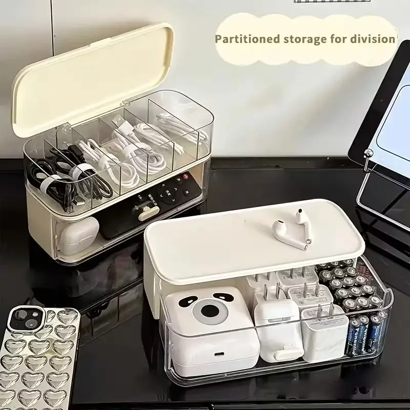 Double-Layer Transparent Desktop Cable Organizer Box, Compact Cord & Charger Storage, Adjustable Compartments, Home Office Use, Table Organizers, Desk Organizer Tidy