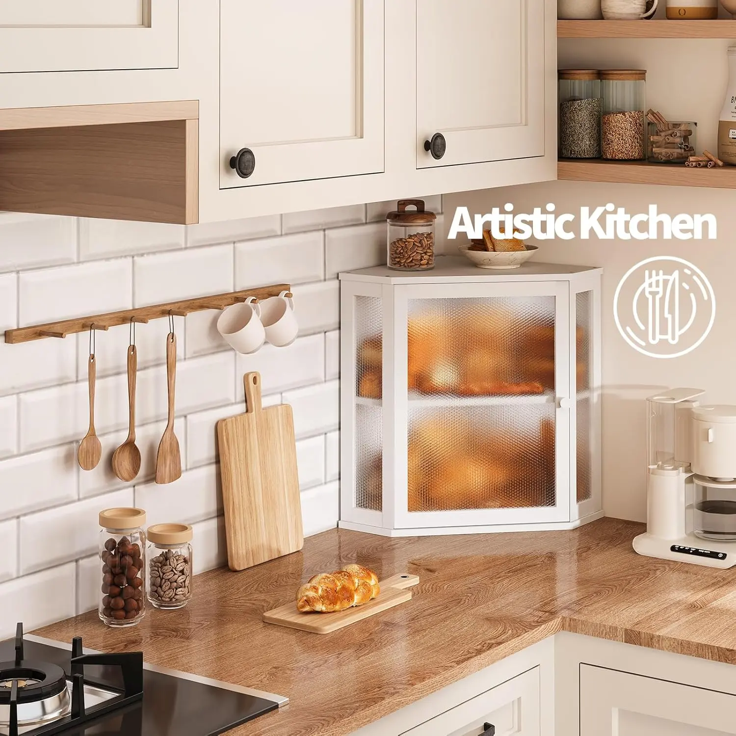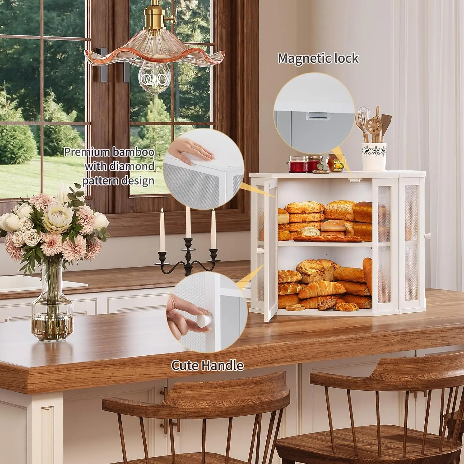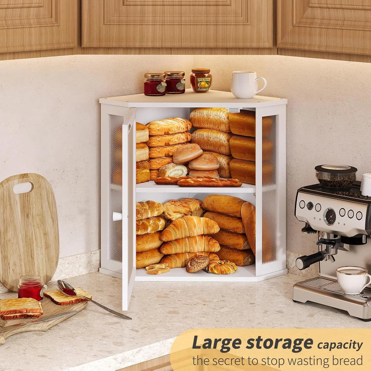 Corner Bread Box for Kitchen Countertop,Bread Storage for Homemade Bread, Double Layer Large Kitchen Storage Bin with Window (White, Large)