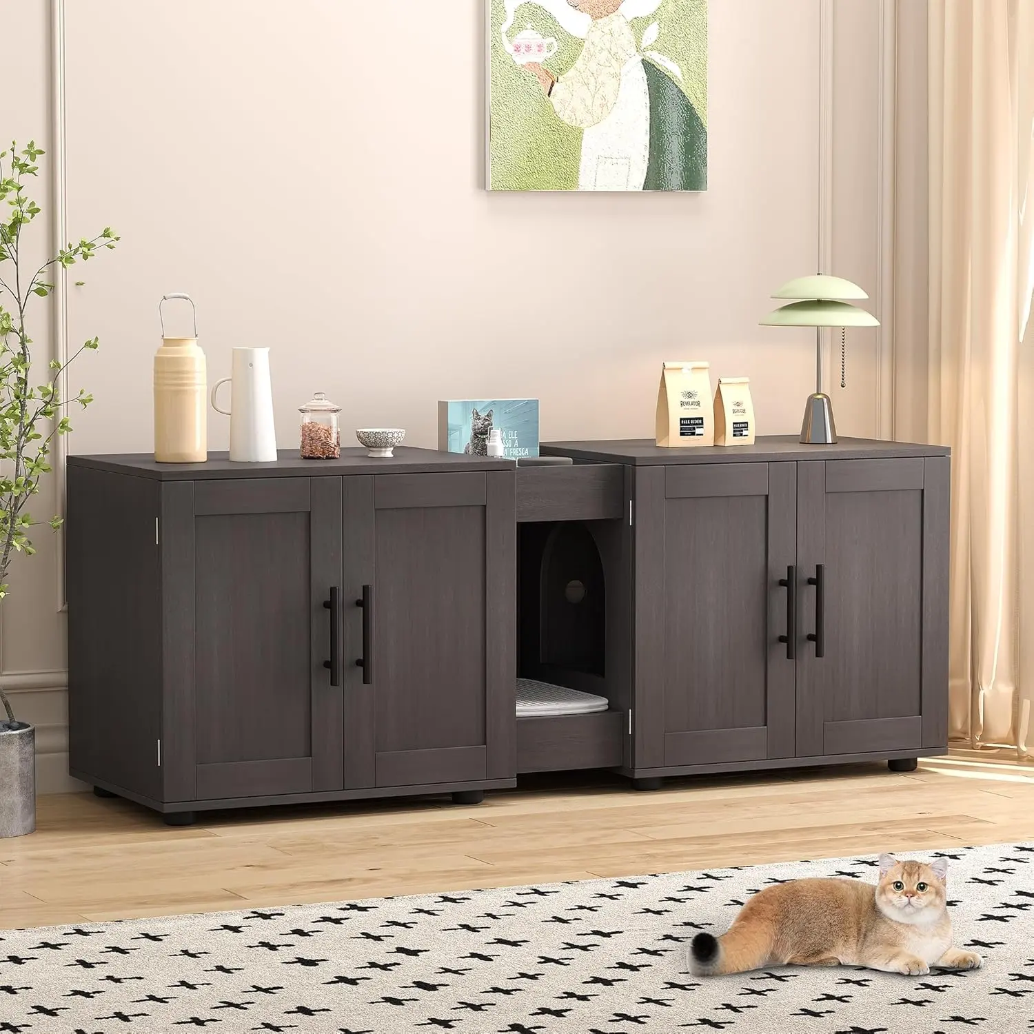 ·Double-room cat litter cabinet design: Our spacious and luxurious two-room cat litter cabinet provides ample space for two cats to comfortably use at the same time. With dimensions of 55”L x 17.7”W x 22.5”L, it can easily accommodate most cat litter boxes, ensuring a convenient and stylish solution for your cats.