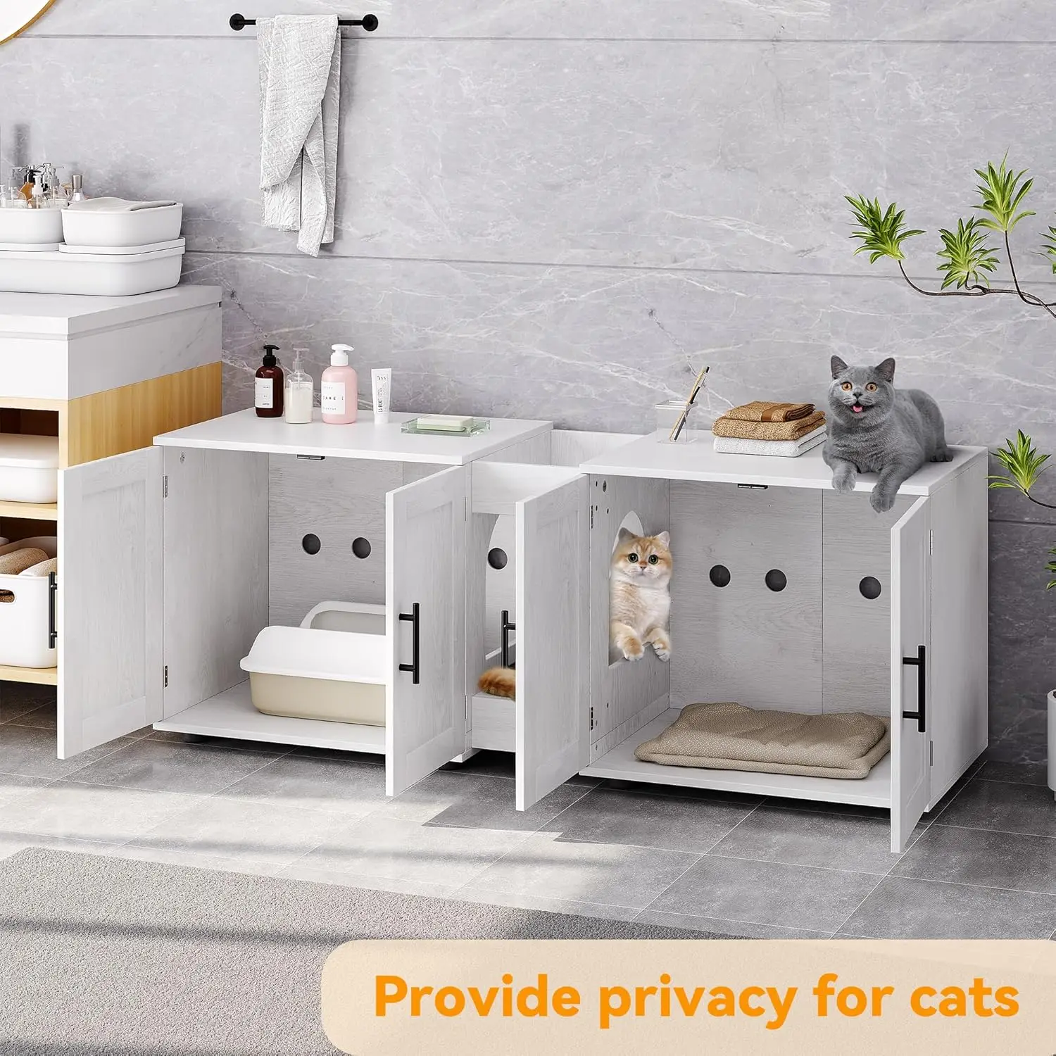 ·Sophisticated design: Our double-cage cat litter cabinet features a carefully designed entrance hole in the middle section, allowing for easy access for your cats while promoting proper ventilation and lighting within the interior space. Additionally, the cabinet is constructed with waterproof materials, making it effortless to clean and maintain.