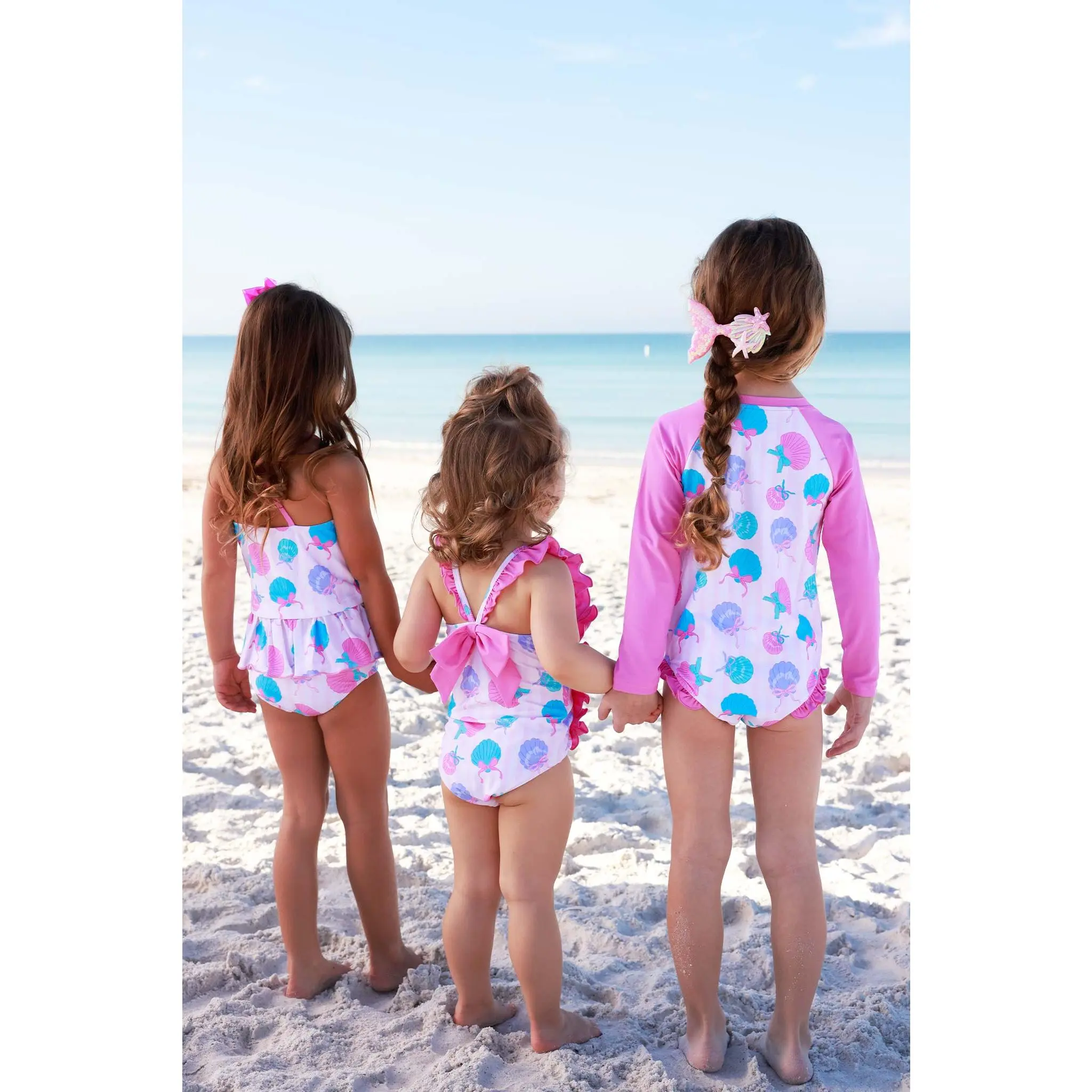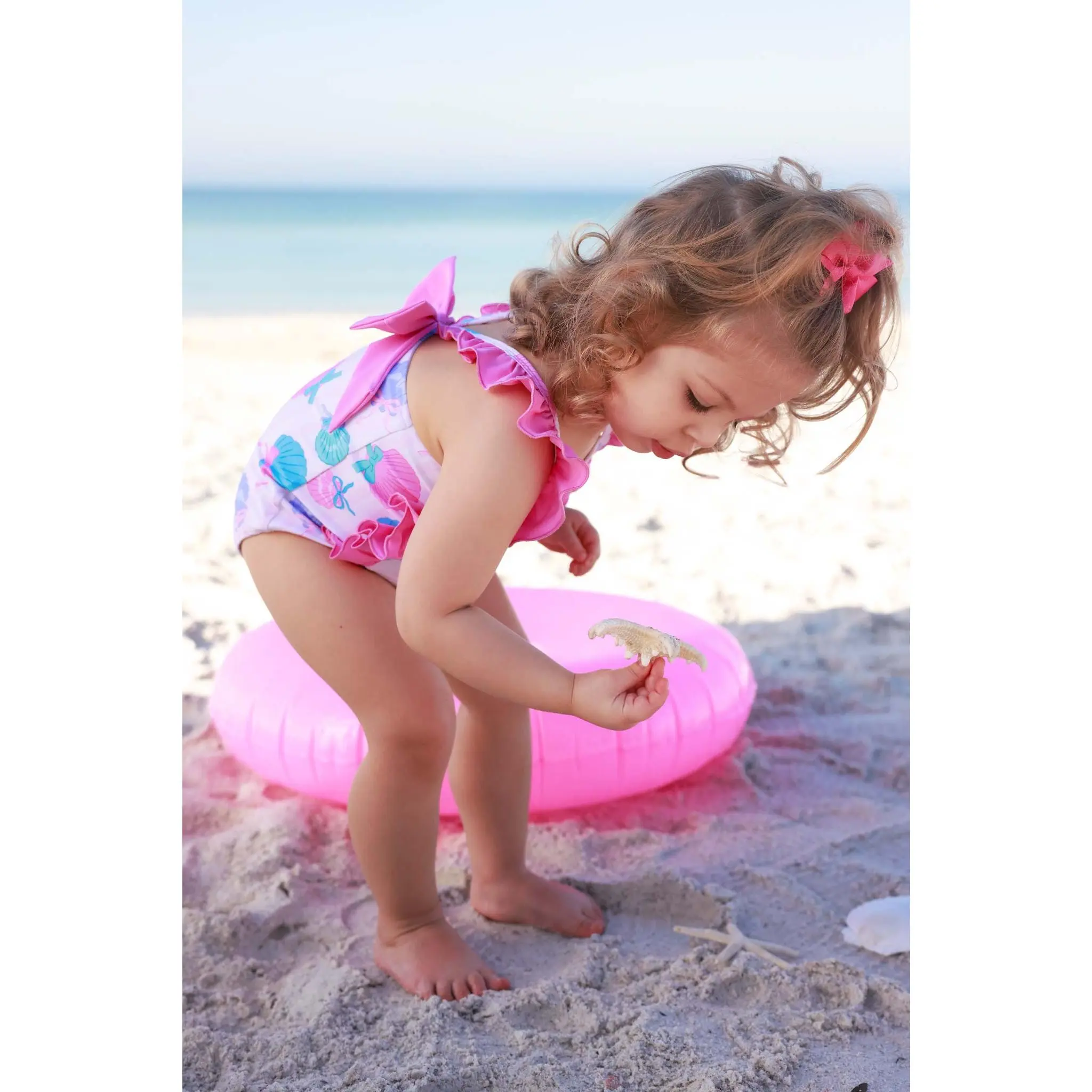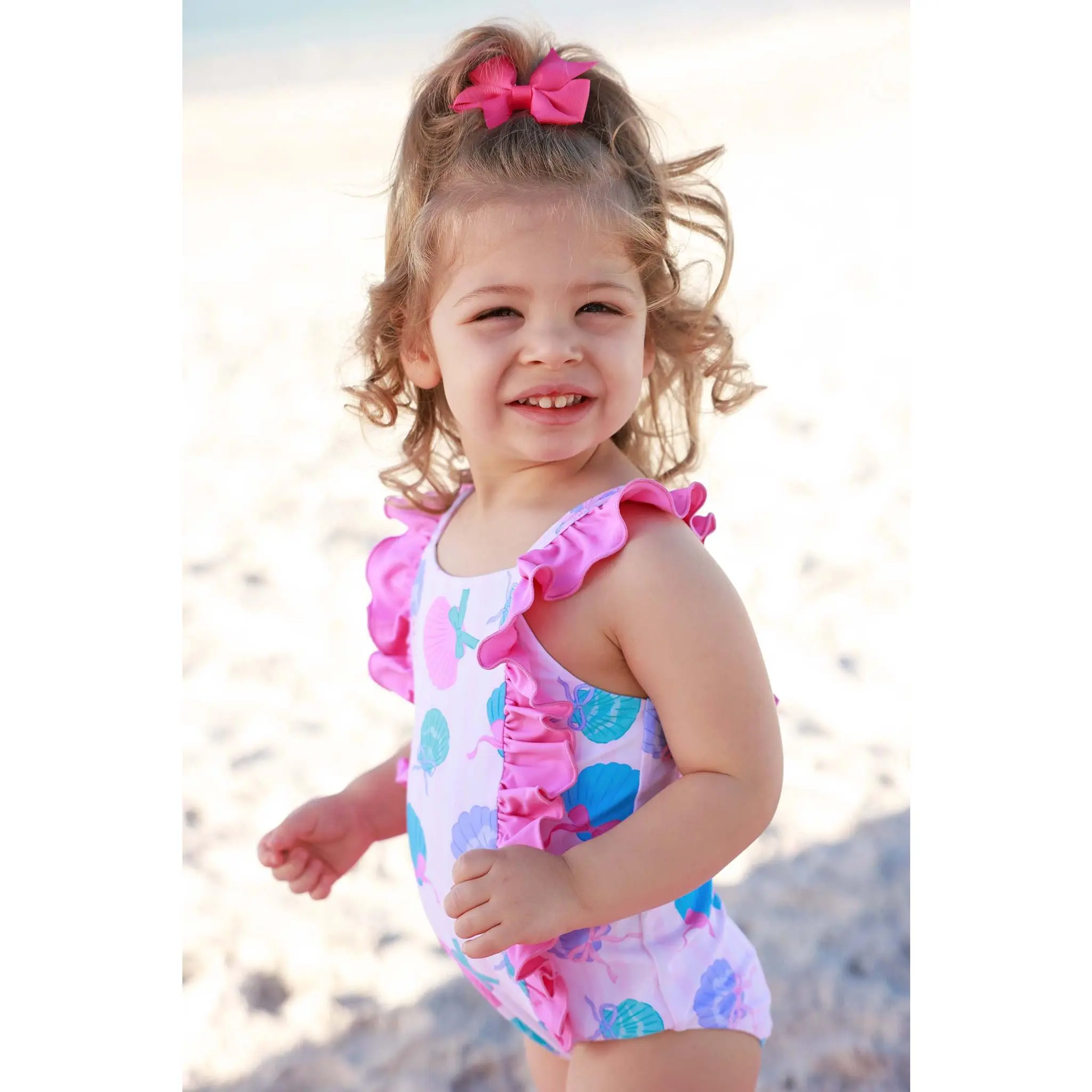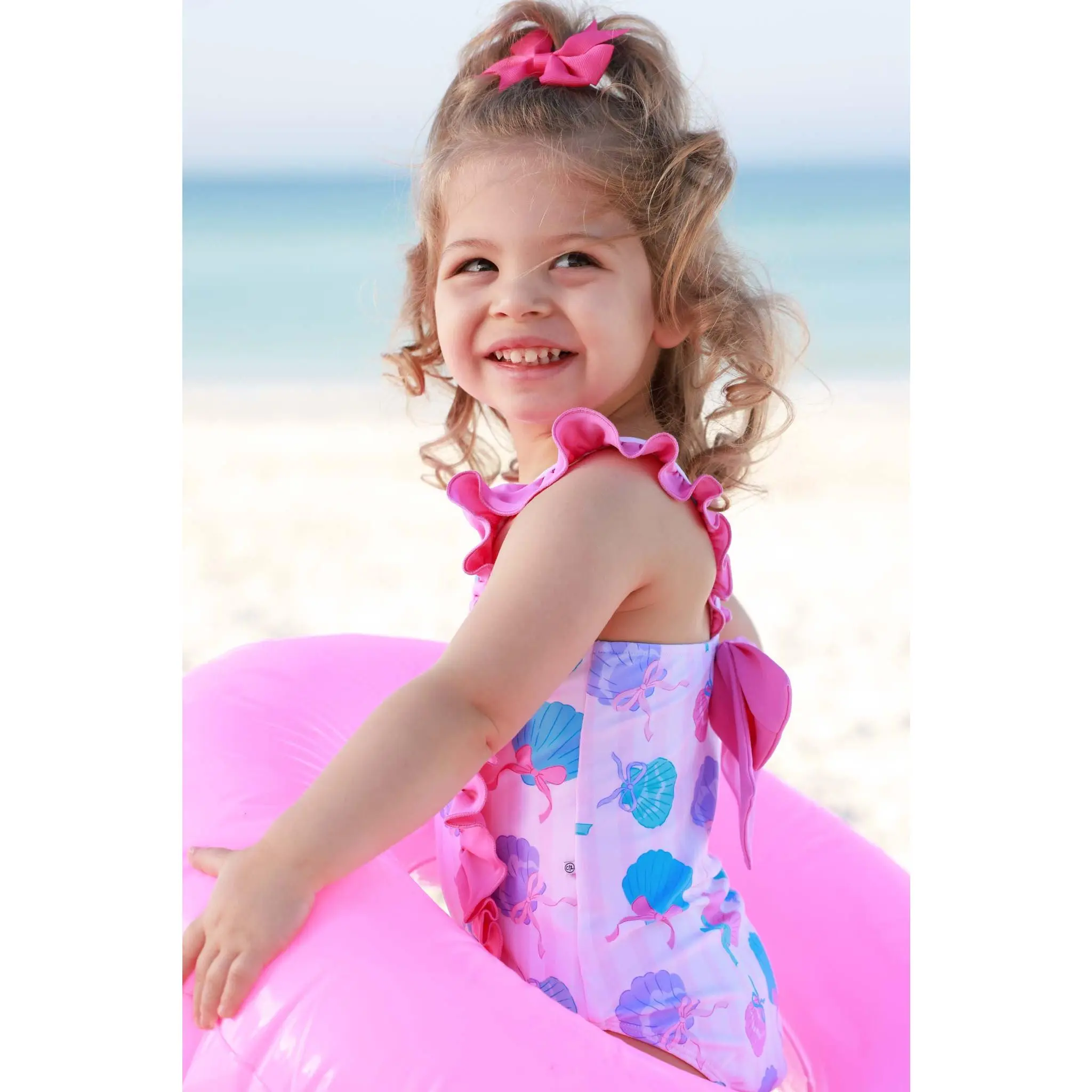 Made for sunny days and seaside fun, our Double Ruffle Bow Back One Piece in Seaside Sweetie is summer in a swimsuit. Featuring playful seashells tied up with sweet bows in cheerful pinks and blues, this print feels fun, nostalgic, and perfect for beach days. The double ruffle detail adds extra charm, while the bow-back design gives it that special little something. Comfy enough for all-day splashing and cute enough for vacation photos, this one piece was made for summer fun!