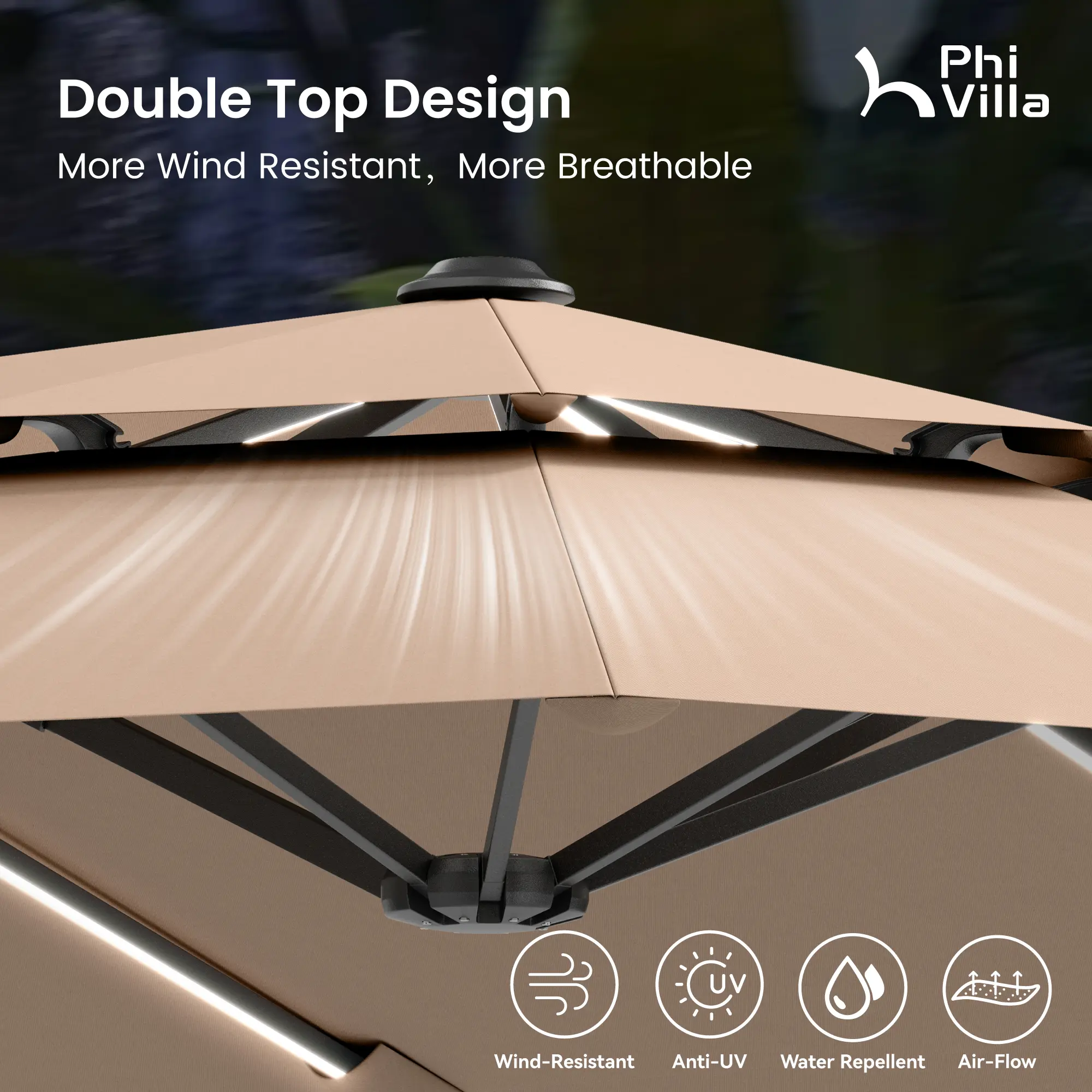 ·Double Vent Top for Better Airflow:Dual vent canopy improves air circulation and reduces wind pressure, helping keep the umbrella stable while maintaining a cooler shaded area during hot summer days.
