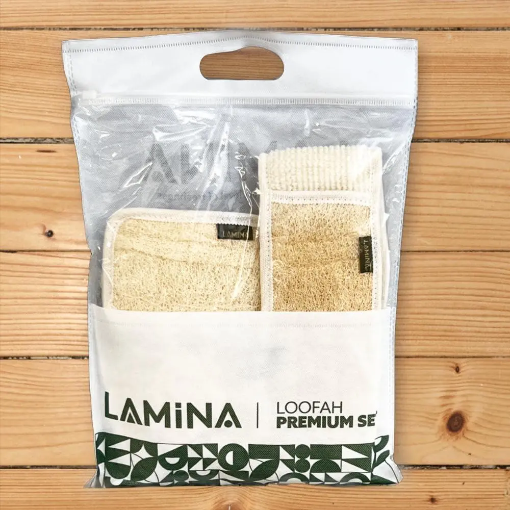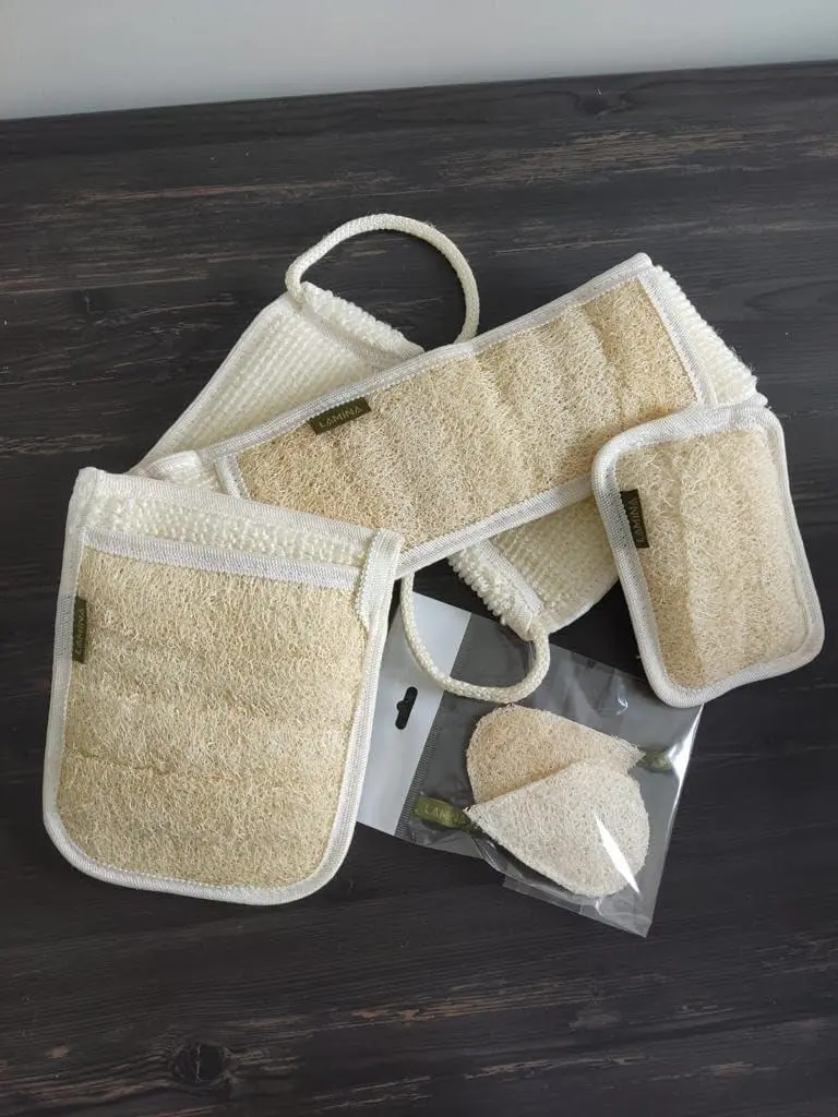 4 PCS - Lamina Natural-Organic, Loofah Sponge, Body Scrubber, Shower Beth Loofah (Back Long, Double Sided Mitt, Mini Mitt and Face loofah)