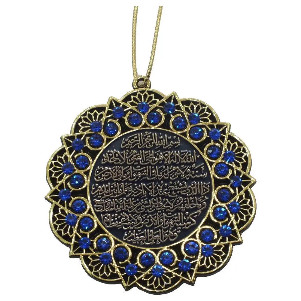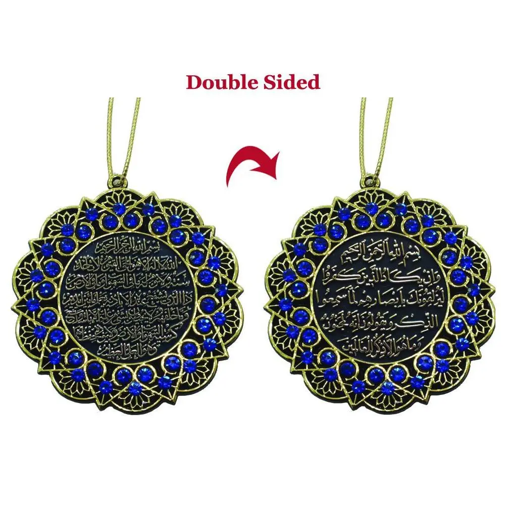 Double-Sided Star Car Hanger Ayatul Kursi & Nazar Dua - Gold/Blue A unique addition to our home decor line! This star shaped, double sided car hanger features Ayatul Kursi and Nazar Dua in intricate Arabic calligraphy. The rhinestones embedded throughout are an exquisite final touch, making this piece the perfect car accessory! Available in several awesome colors! Material: Plastic Diameter: 7cm (2.75in) Cord length of each may differ slightly; varies between 6 inches (15cm) and 9 inches (23cm) Made in Turkey