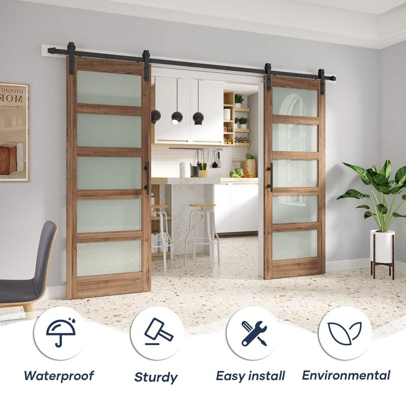 EASELIFE presents the Double Sliding Frosted Glass Barn Doors, perfect for enhancing your home's aesthetic. These doors feature a wooden structure and frosted glass panels, offering both functionality and style. Ideal for various interior designs, they add a touch of modern elegance. Transform your space effortlessly with these doors.