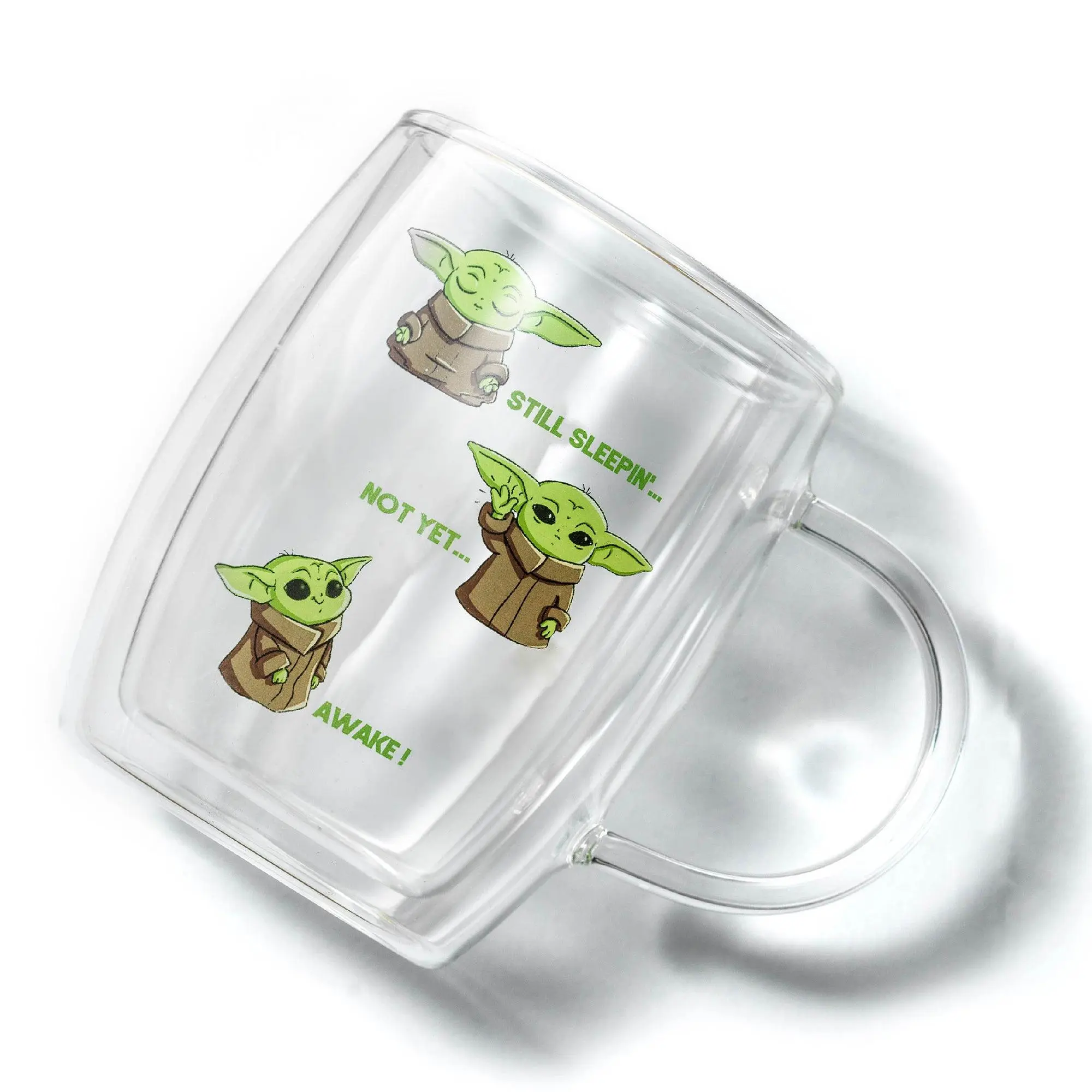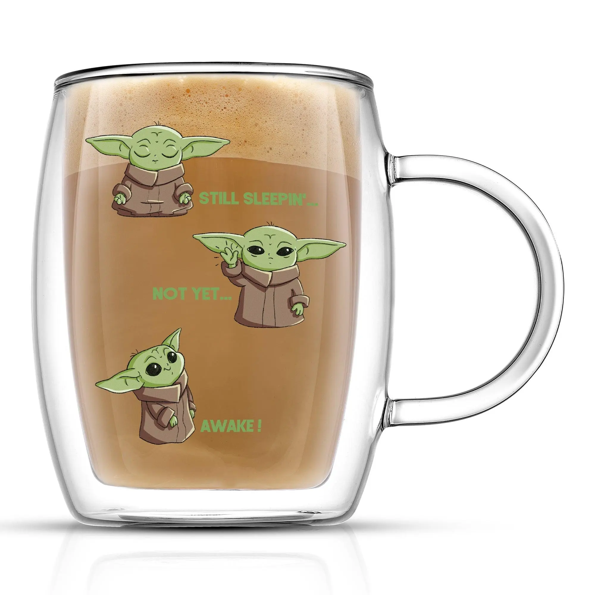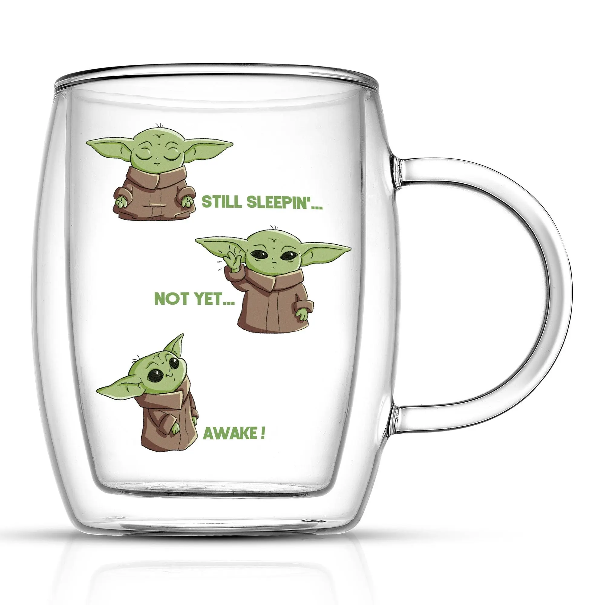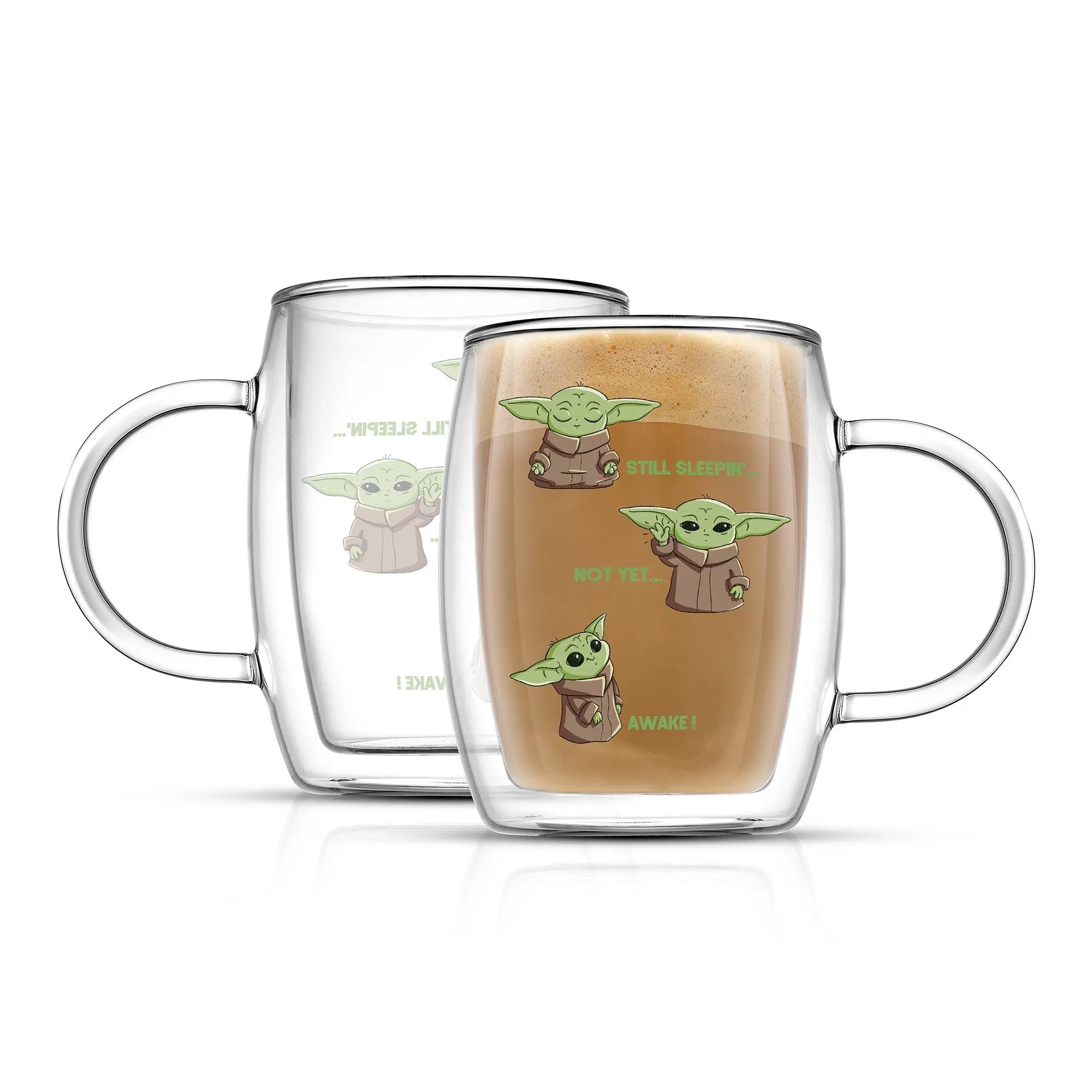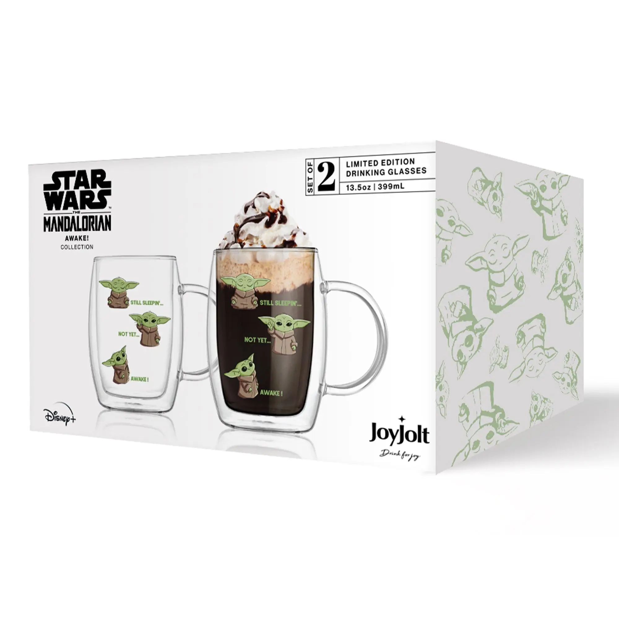 May the brew be with you! These JoyJolt Star Wars™ The Mandalorian™ Awake double wall mugs are the perfect way to start your day. Crafted from lead free glass, they keep your drink hot or cold for extended enjoyment, no matter your mission. But the real fun is in the design – featuring Grogu™ still sleepin'… not yet… awake! Perfect for adding a touch of intergalactic whimsy to your morning routine or afternoon pick-me-up.