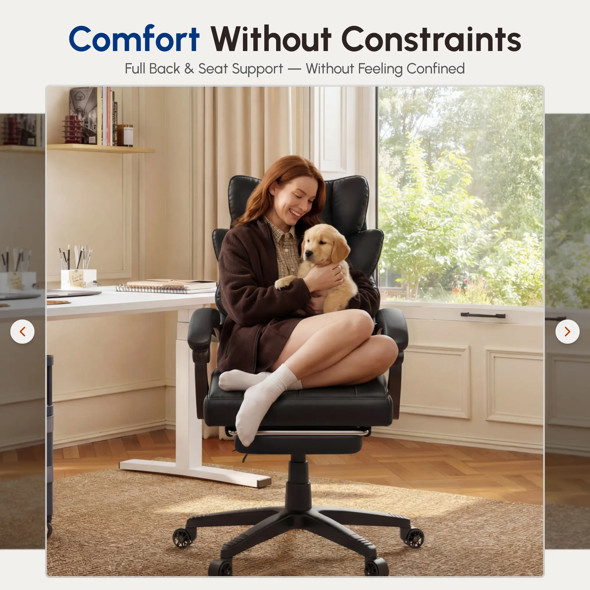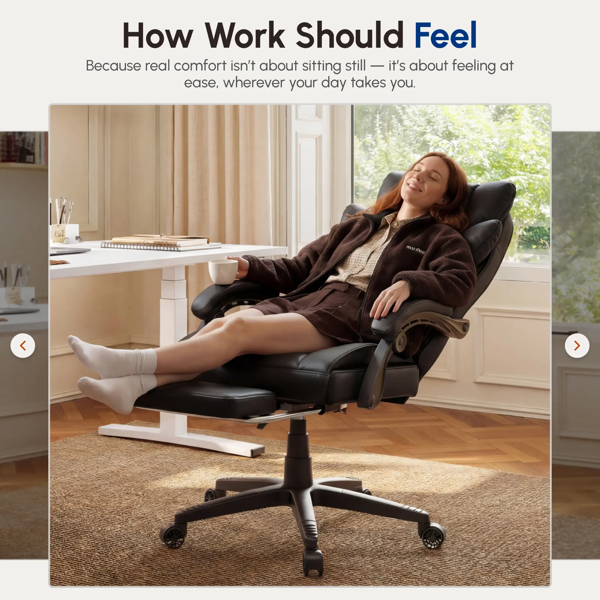 ·Flexible Adjustability: This executive chair offers a reclining range from 90° to 135°, accommodating various activities whether you’re working or relaxing. Additionally, the linkage armrests move in sync with the chair’s recline, continuously supporting your arms and posture throughout every angle