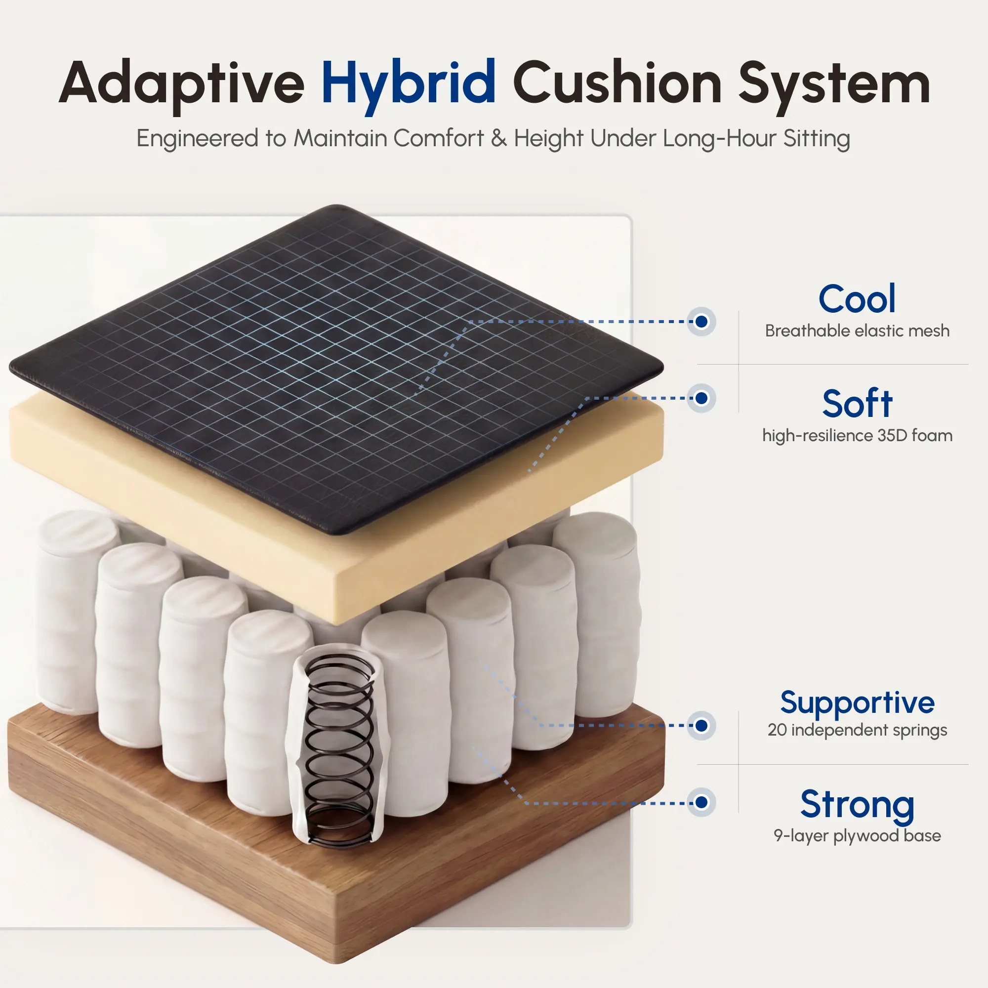 ·Individual Pocket Springs:The seat cushion is composed of pocket springs, a type of spring commonly used in sofas. Each spring operates independently, offering elasticity and support by adapting to pressure and contouring to your body's weight, providing a luxurious and comfortable experience akin to that of a sofa