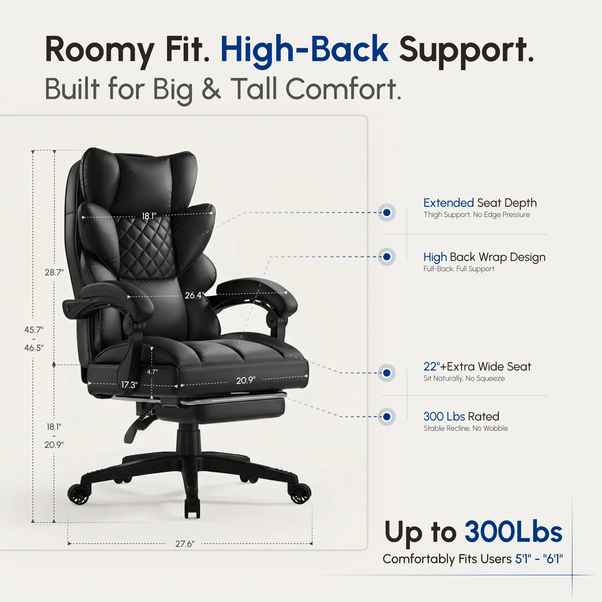 ·Double-Layered Thickened Backrest: This big and tall office chair features a dual-layer backrest design with a soft cushioning layer and a supportive layer, offering enhanced comfort and ergonomic support even during extended periods of sitting