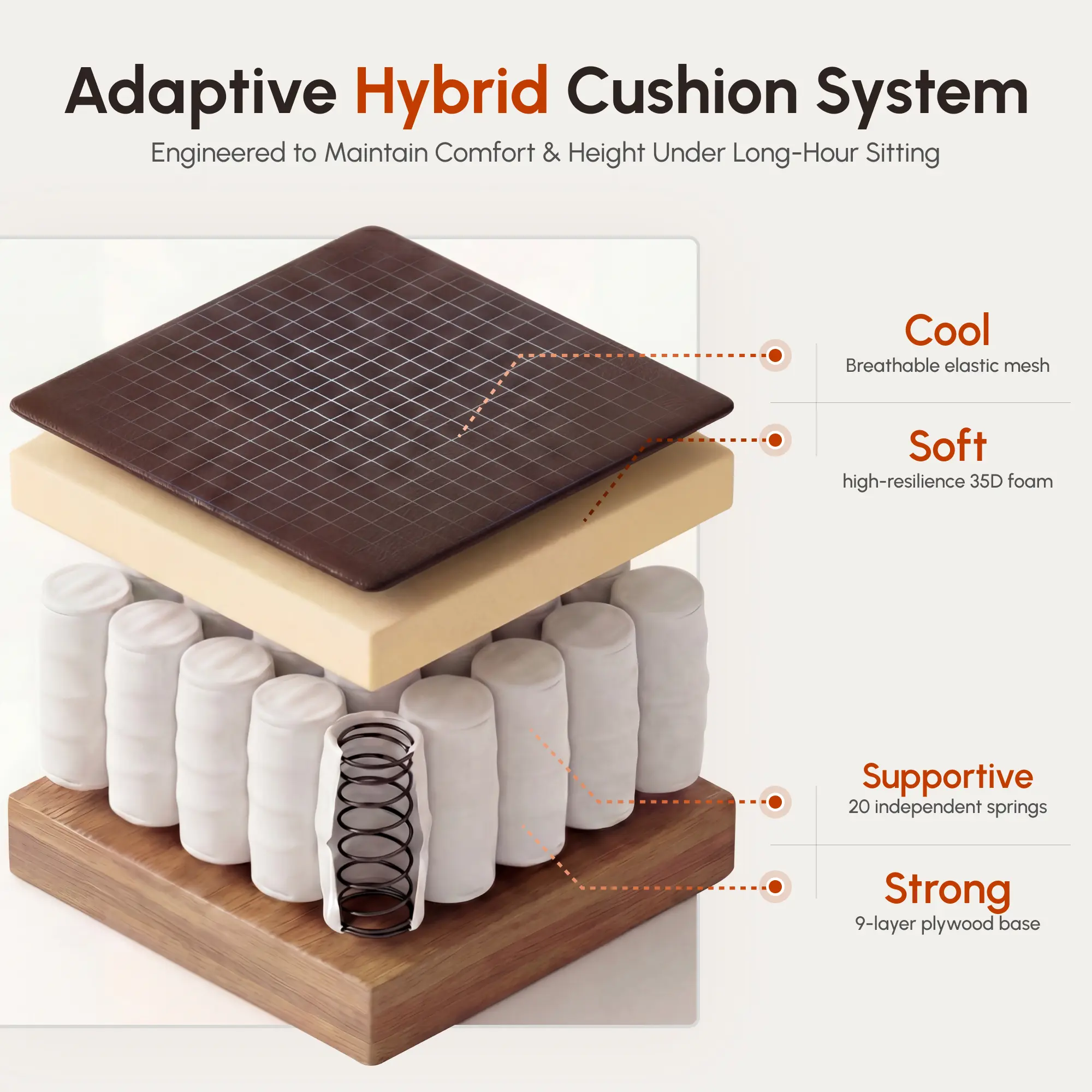 ·Individual Pocket Springs:The seat cushion is composed of pocket springs, a type of spring commonly used in sofas. Each spring operates independently, offering elasticity and support by adapting to pressure and contouring to your body's weight, providing a luxurious and comfortable experience akin to that of a sofa