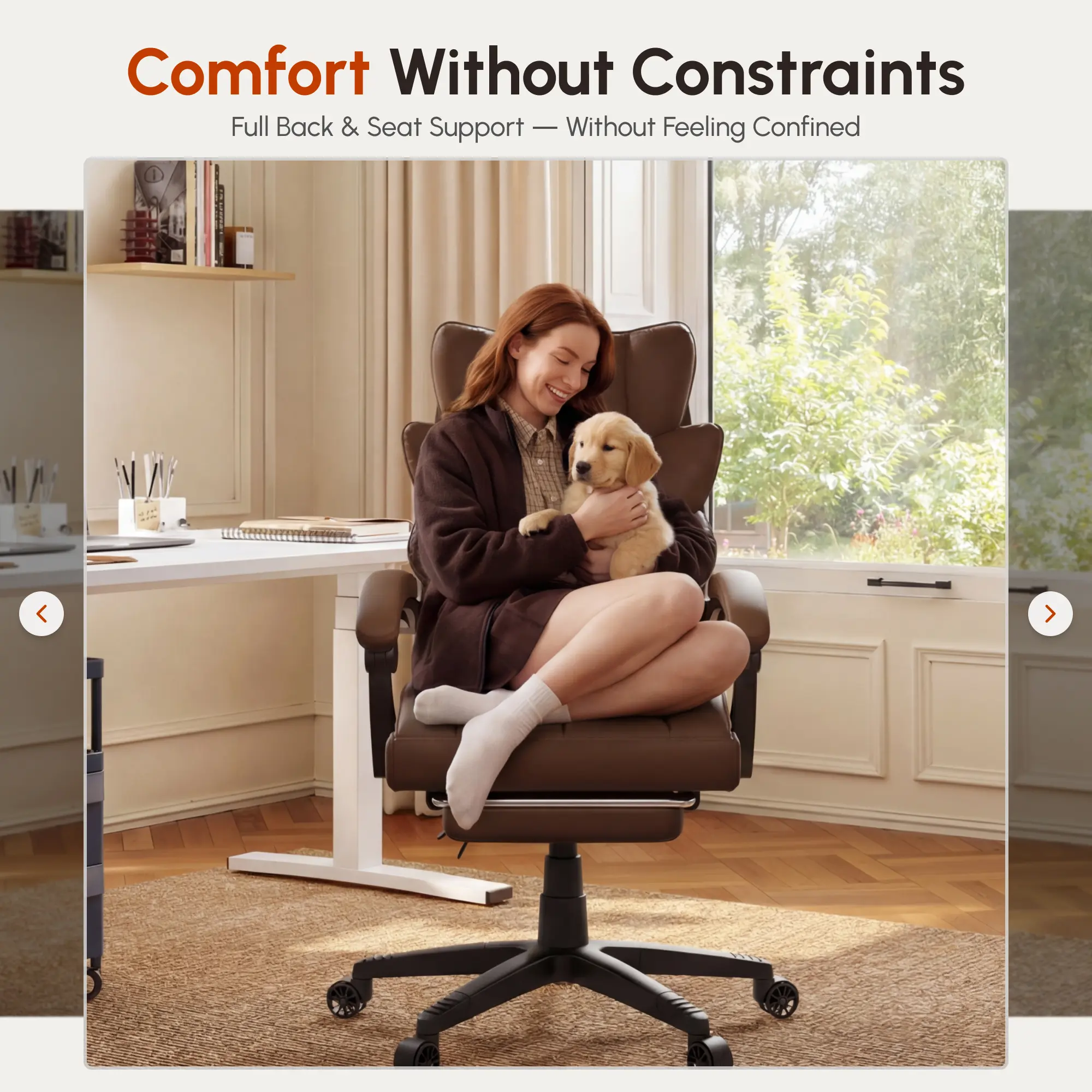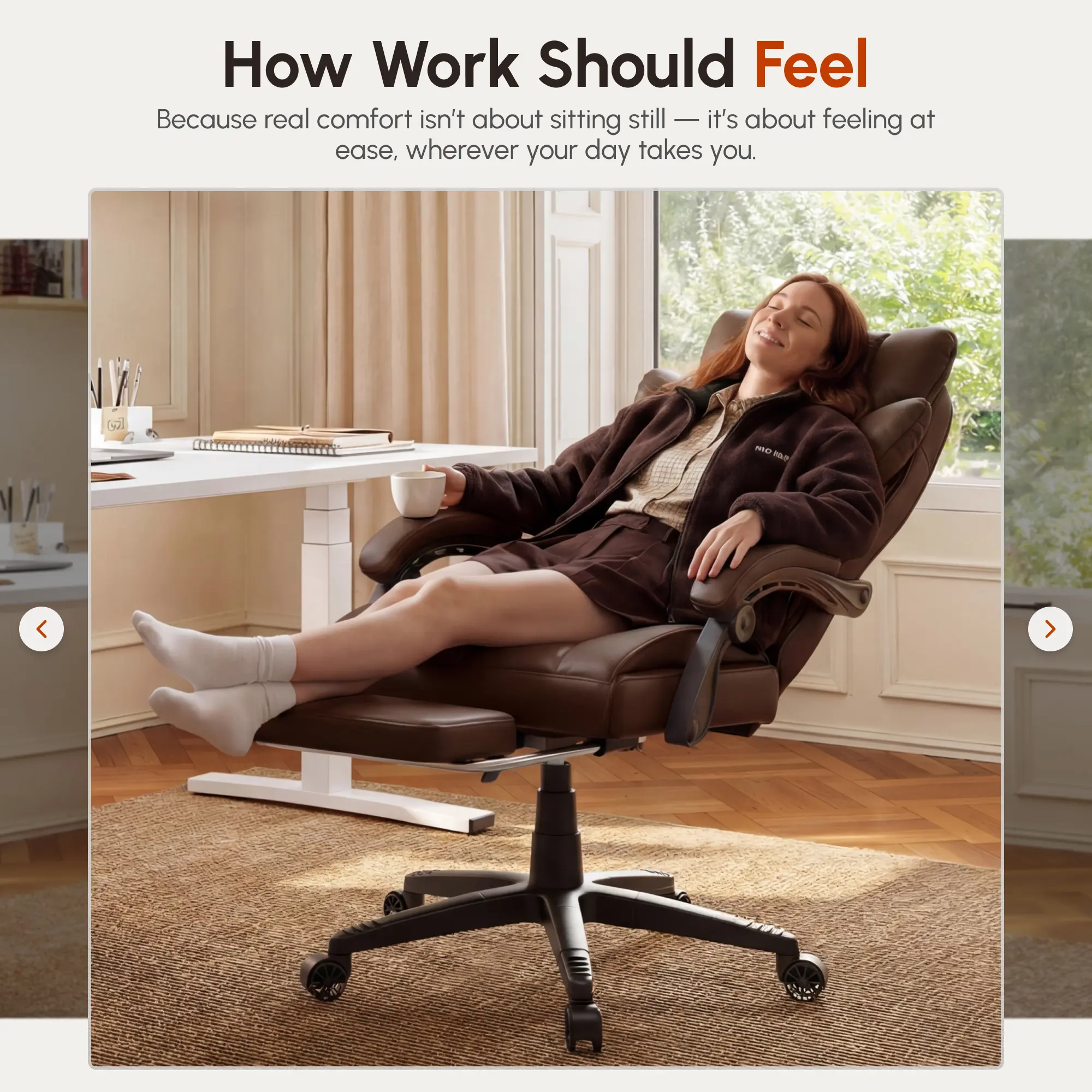 ·Flexible Adjustability: This executive chair offers a reclining range from 90° to 135°, accommodating various activities whether you’re working or relaxing. Additionally, the linkage armrests move in sync with the chair’s recline, continuously supporting your arms and posture throughout every angle