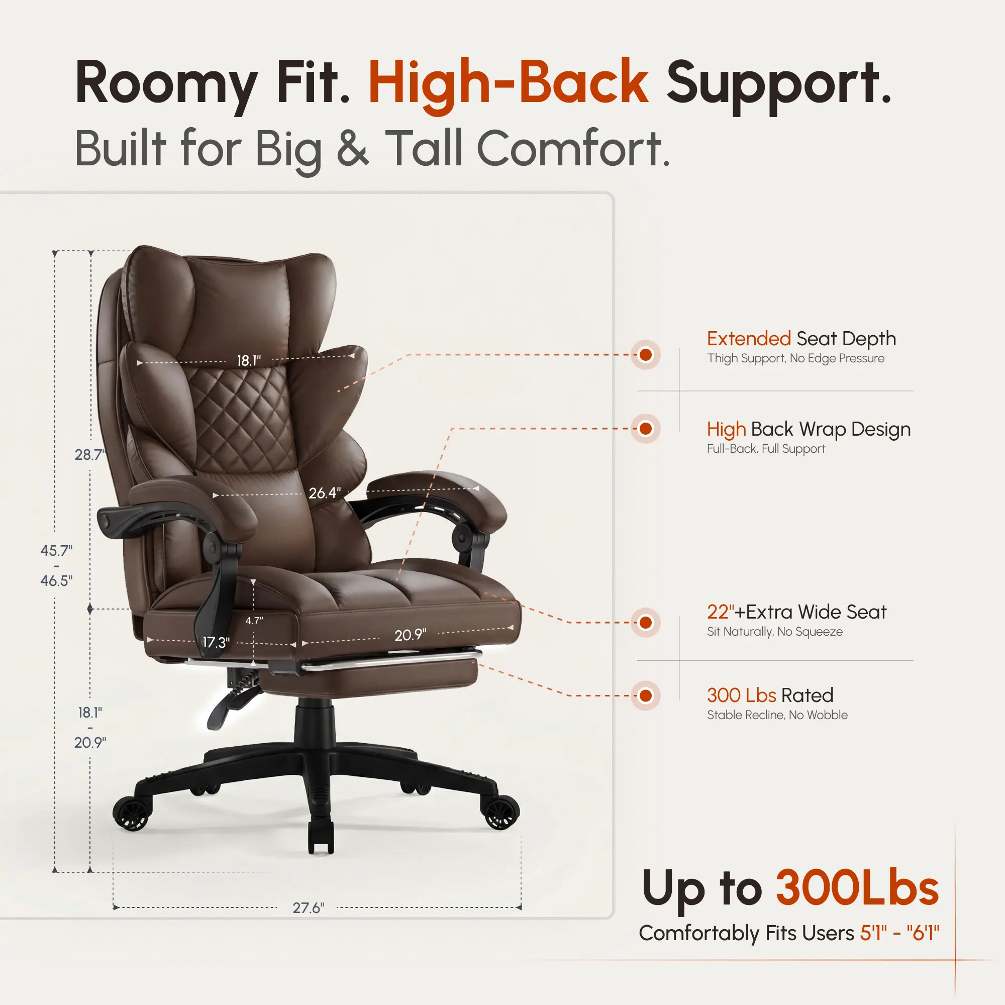 ·Double-Layered Thickened Backrest: This big and tall office chair features a dual-layer backrest design with a soft cushioning layer and a supportive layer, offering enhanced comfort and ergonomic support even during extended periods of sitting