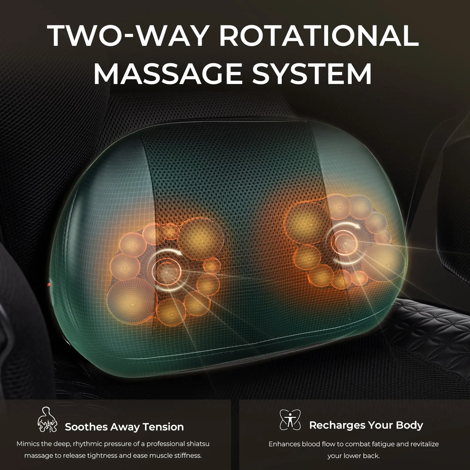 ·Dual-Rotation Massage System:This ingenious lumbar pillow offers both daily support and deep tissue massage. Keep the smooth side up for perfect ergonomic support while working. Feeling tight? Just flip it over! The massage side goes to work, delivering a powerful, bidirectional kneading action to your lower back, turning any chair into a relaxation throne
