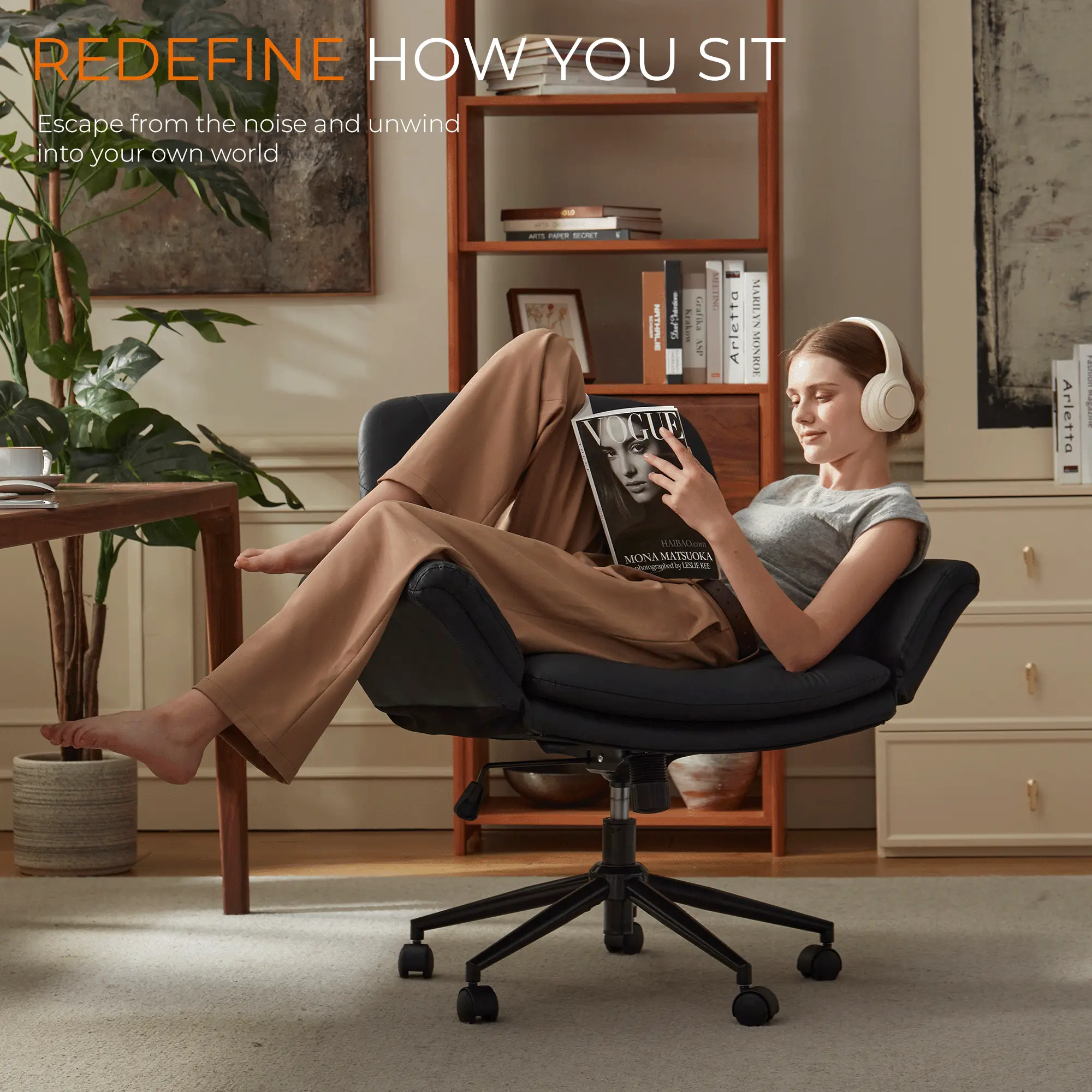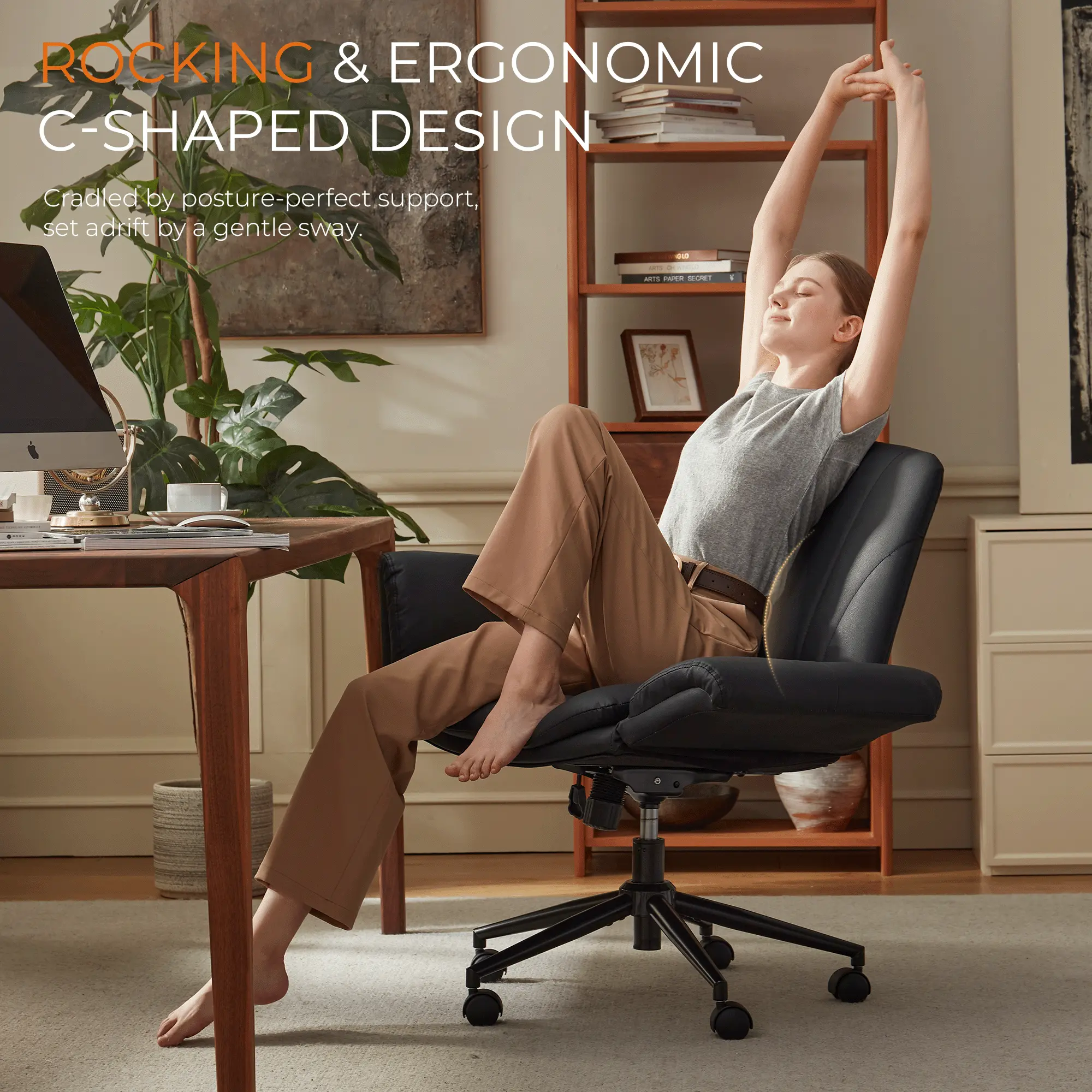 ·REVOLUTIONARY 5-GEAR ADJUSTABLE ARMRESTS - Experience unparalleled comfort and support with our 5 position armrests. Our criss cross chair with arms designed specifically for the cross leg sitting position and beyond, micro-tilt gears provide 15°-70° elbow support for any posture you choose, transforming how you work, study, relax, game or makeup.