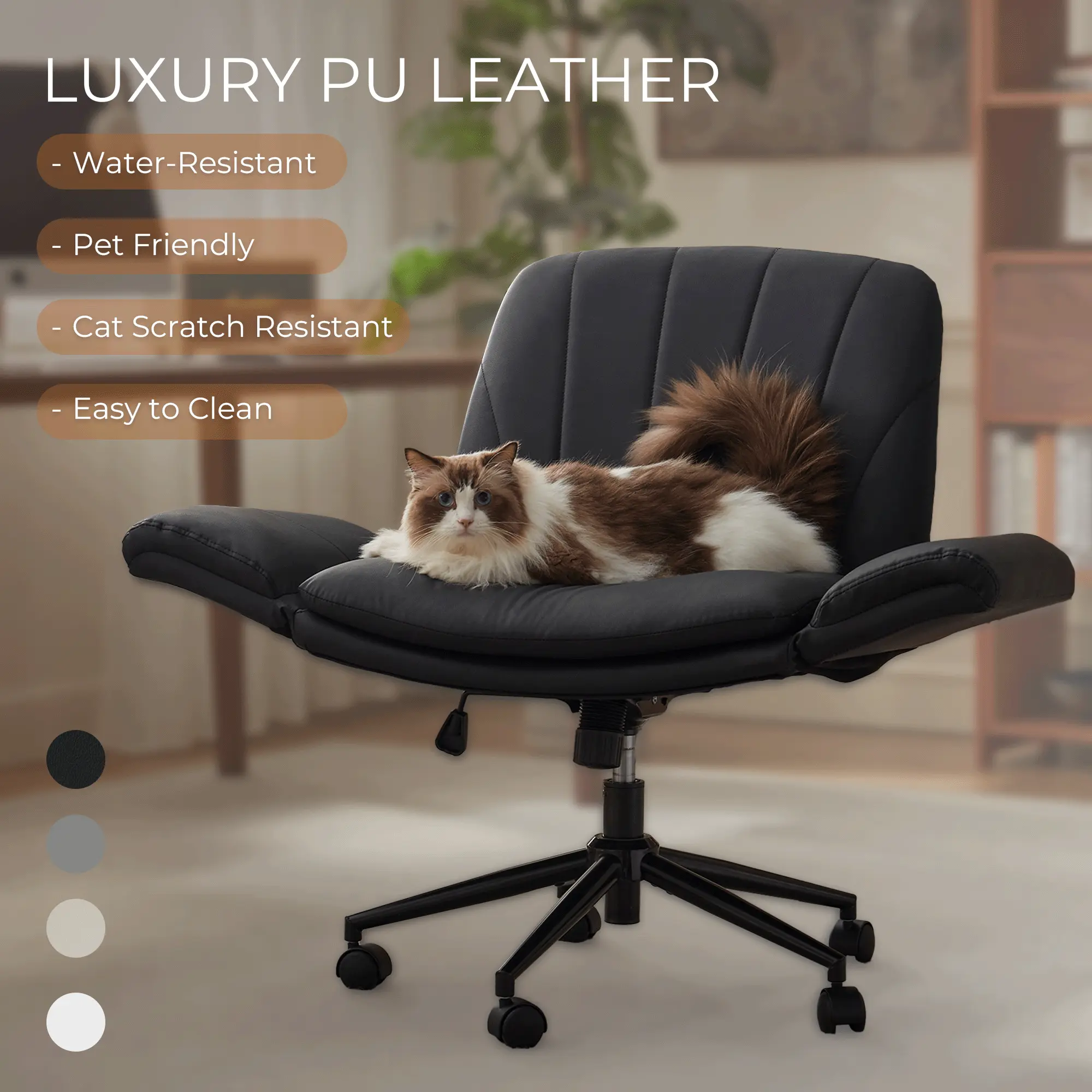 ·LUXURIOUS & DURABLE PREMIUM PU LEATHER- Upholstered in high-grade, eco-friendly PU leather, our criss cross desk chair offers exceptional softness and a sophisticated look. It’s meticulously crafted to be water-resistant, scratch-resistant (pet-friendly!), and incredibly easy to maintain – simply wipe clean to restore its pristine appearance year after year.
