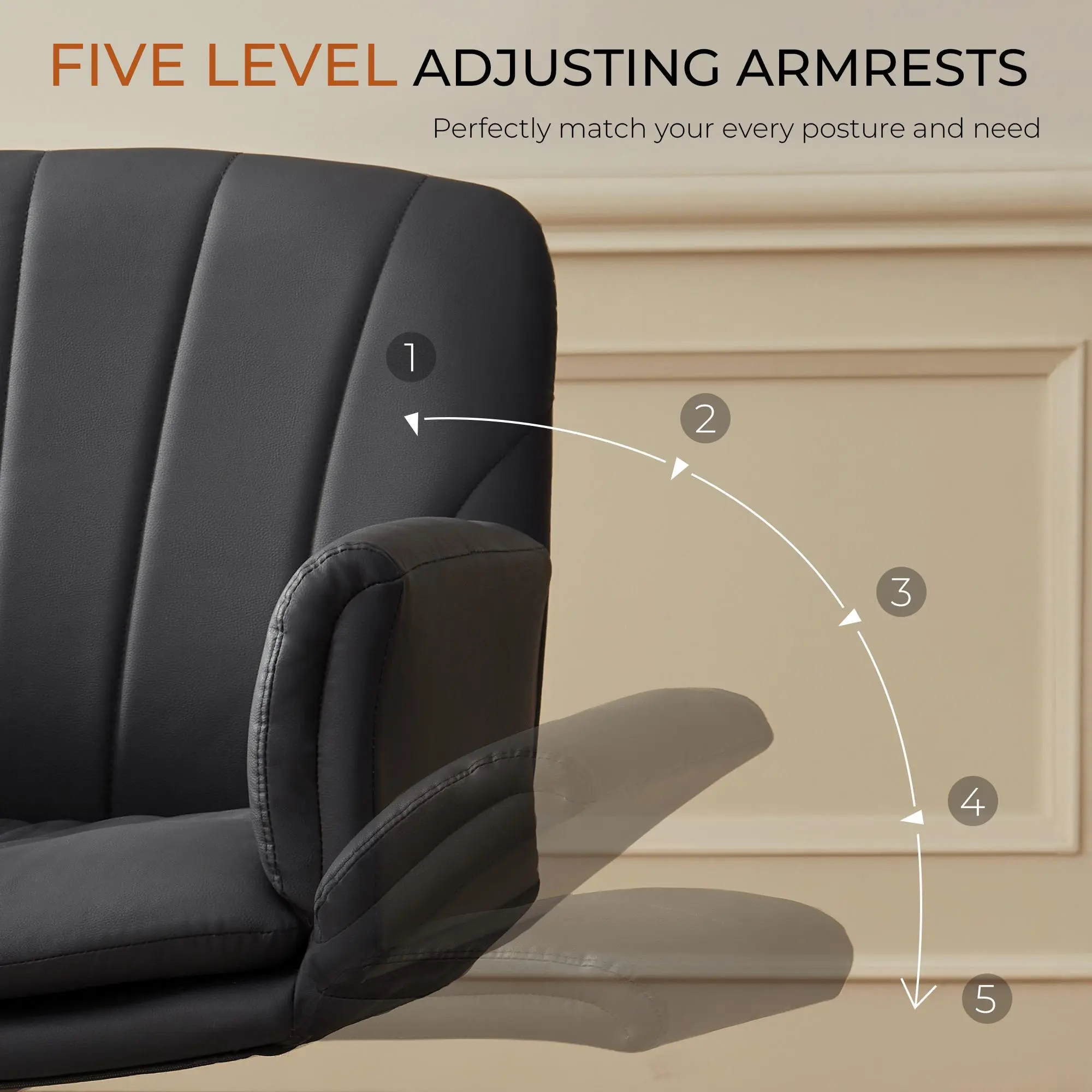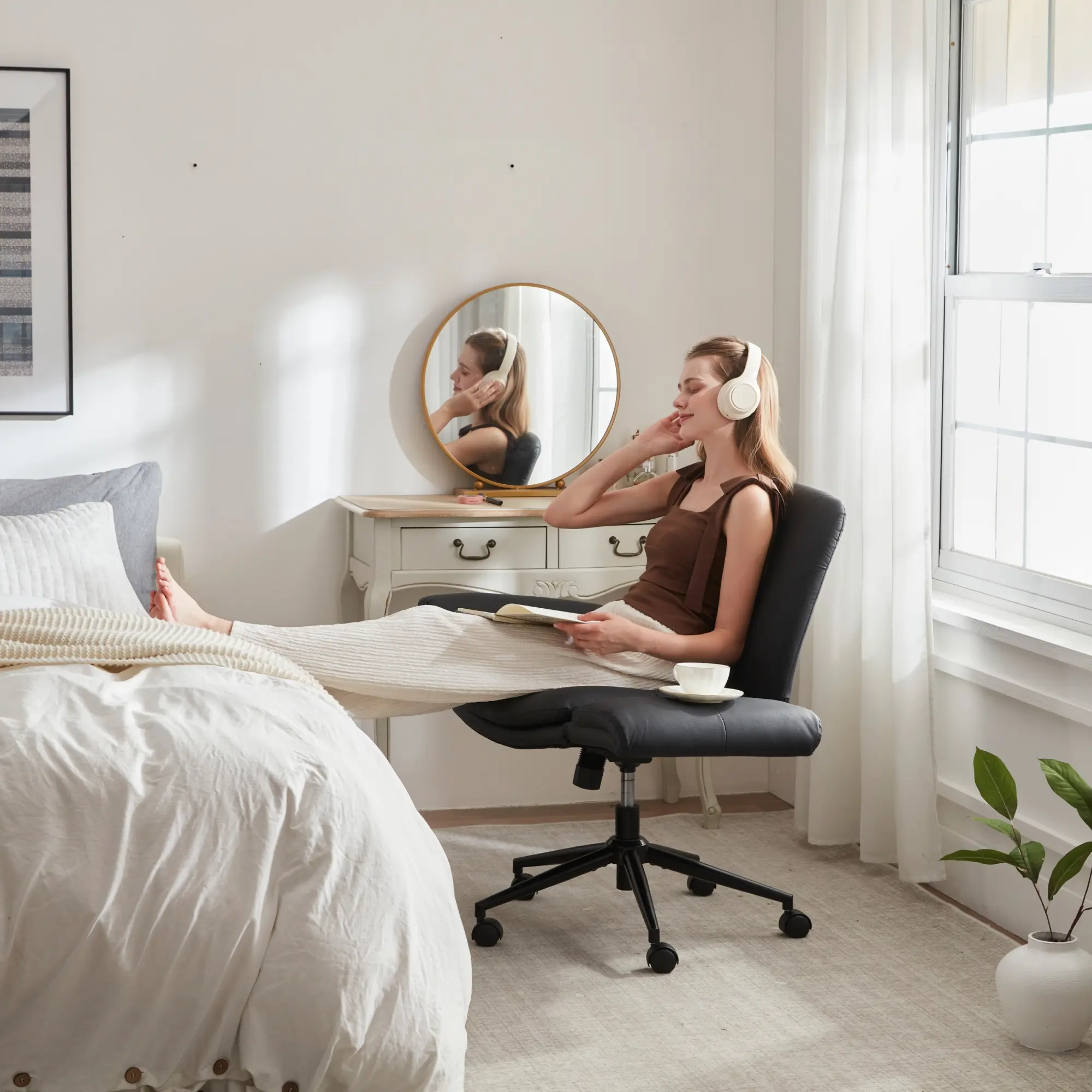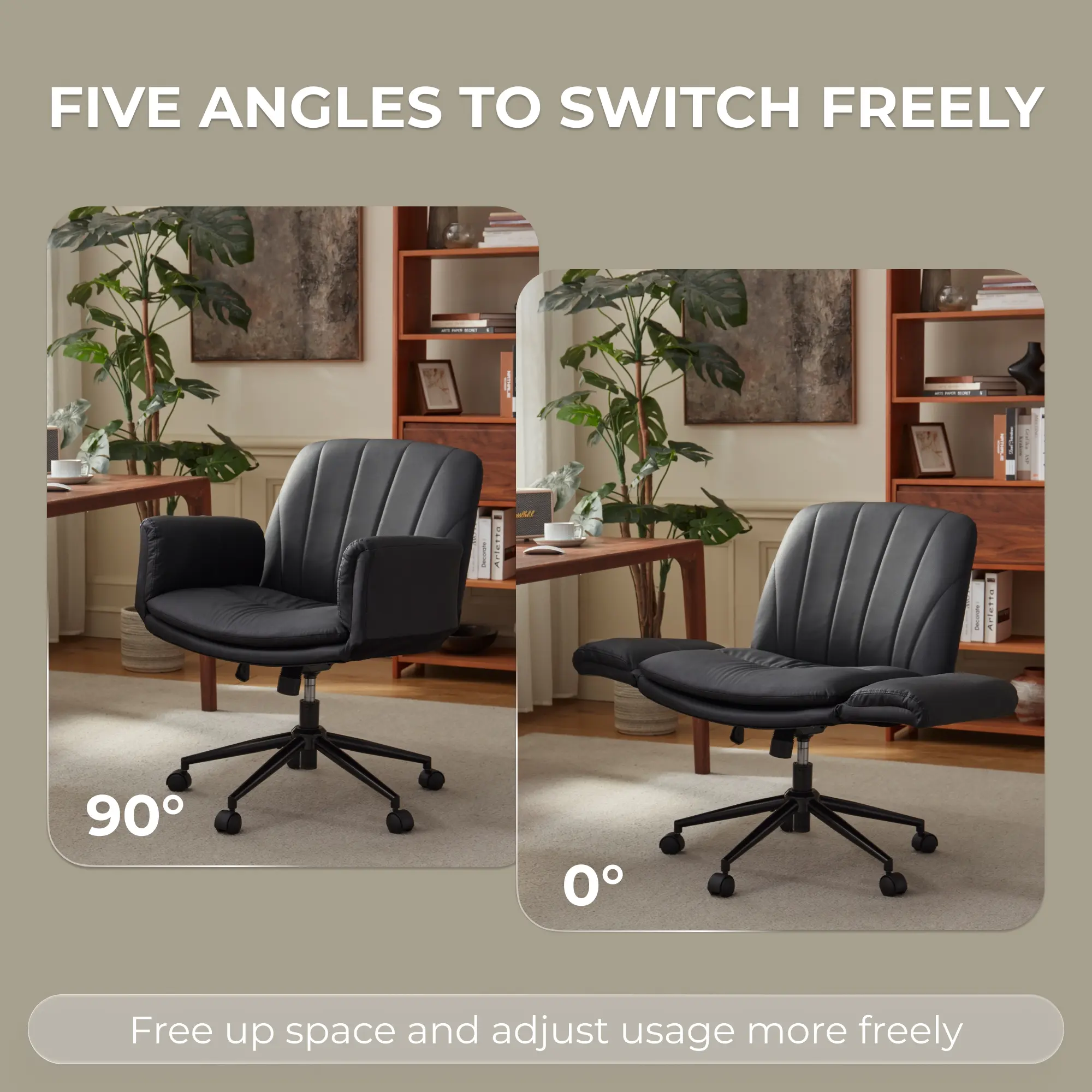 ·REVOLUTIONARY 5-GEAR ADJUSTABLE ARMRESTS - Experience unparalleled comfort and support with our 5 position armrests. Our criss cross chair with arms designed specifically for the cross leg sitting position and beyond, micro-tilt gears provide 15°-70° elbow support for any posture you choose, transforming how you work, study, relax, game or makeup.