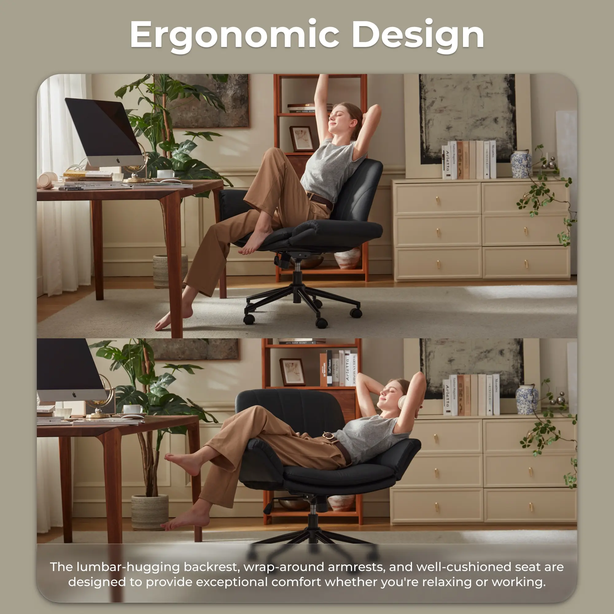 ·ULTIMATE COMFORT- Experience all-day support with our enhanced high backrest that perfectly cradles your spine. The thickened lumbar cushion delivers targeted pressure relief to your lower back, while the premium double-layered seat pad with slow-rebound memory foam top with a high-resilience support base. Engineered for prolonged sitting sessions, this criss cross chair with wheels keeps you comfortably focused whether working, gaming, or relaxing for hours.