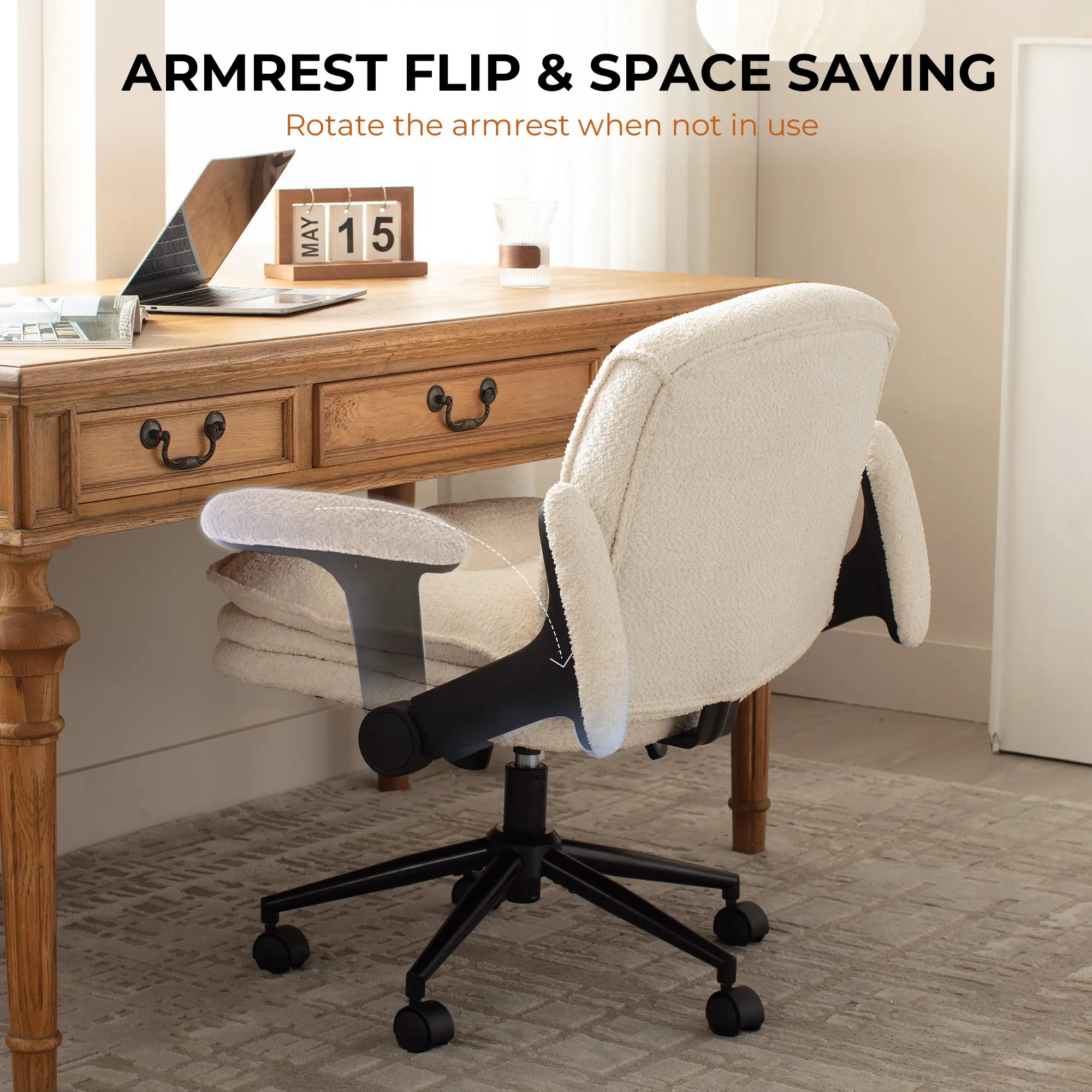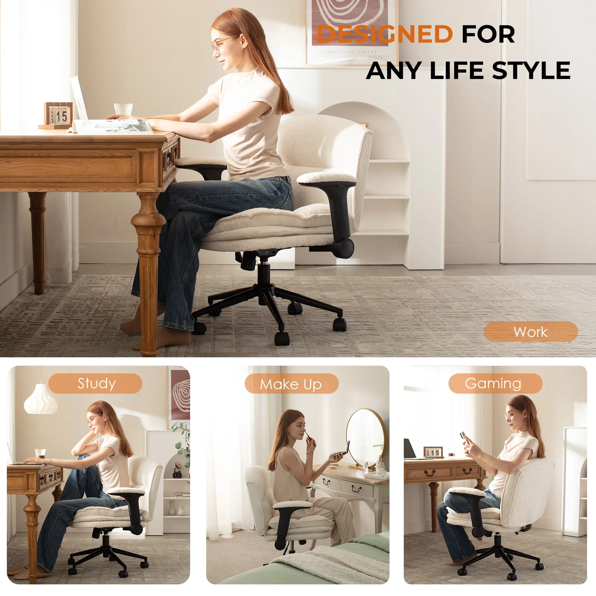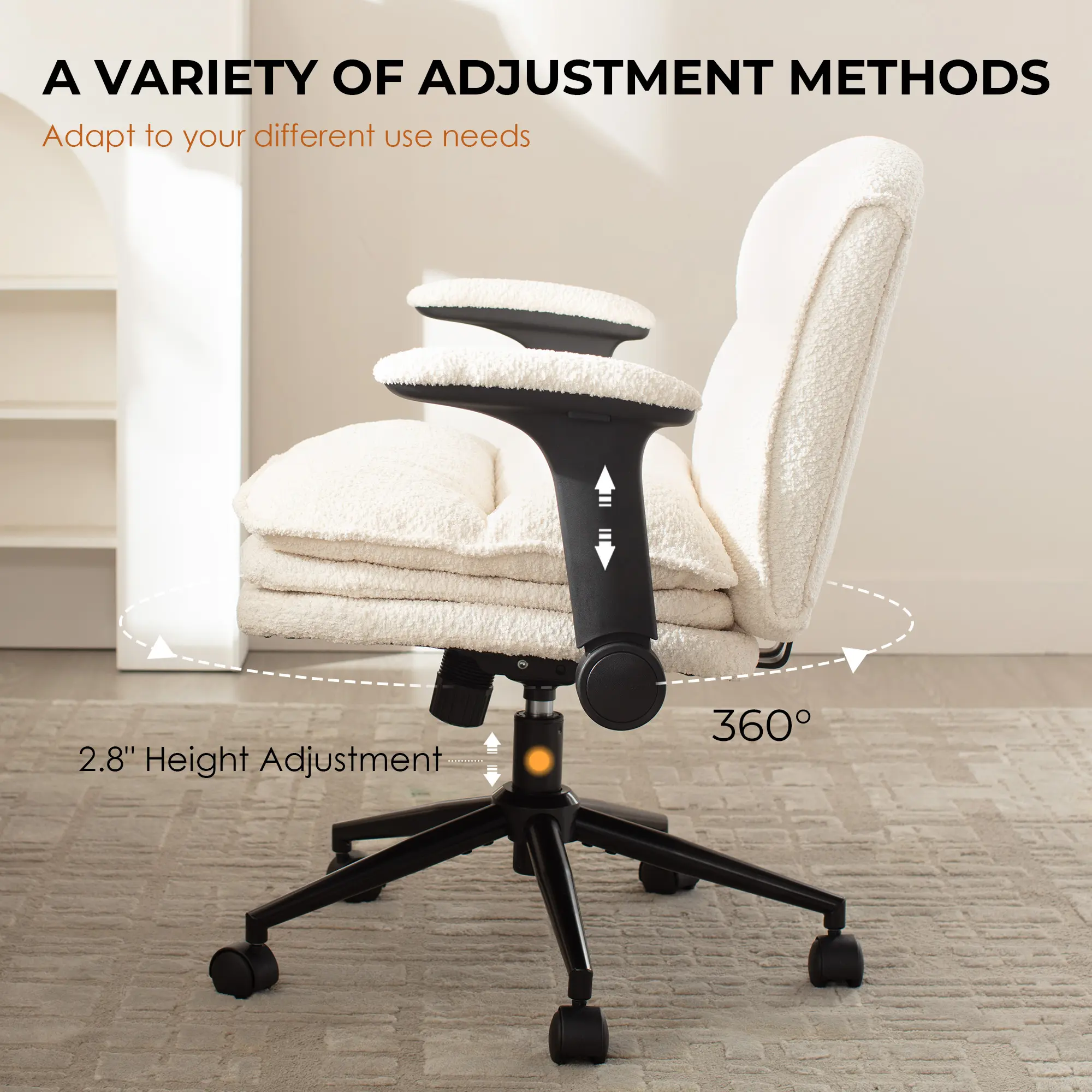 ·ADJUSTABLE ARMRESTS& SPACE SAVING- Easily flip up the armrest of our vanity chair when not in use, which can be elevated to a 90° angle. This makes it easy to save space. The height of the chair and armrest can be adjusted to suit people of different heights.