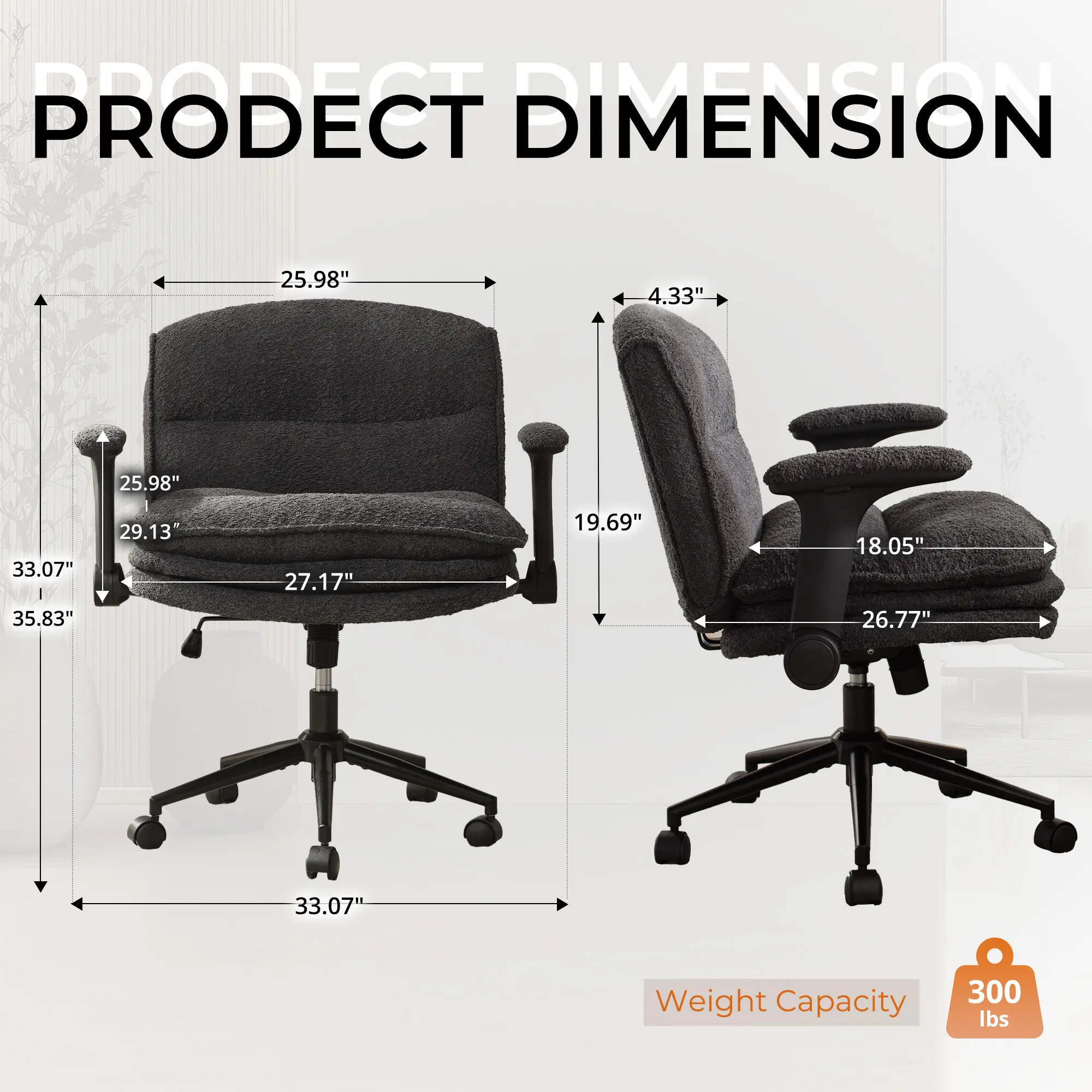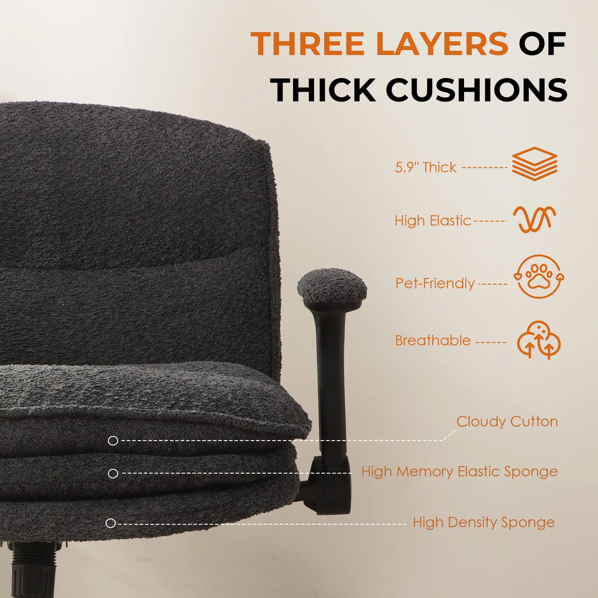 I love the space the chair provides, however, the cushioning has gone away within 1-month (or less) of purchase. Due to this, there isn’t any support when I sit down and it feels stiff.