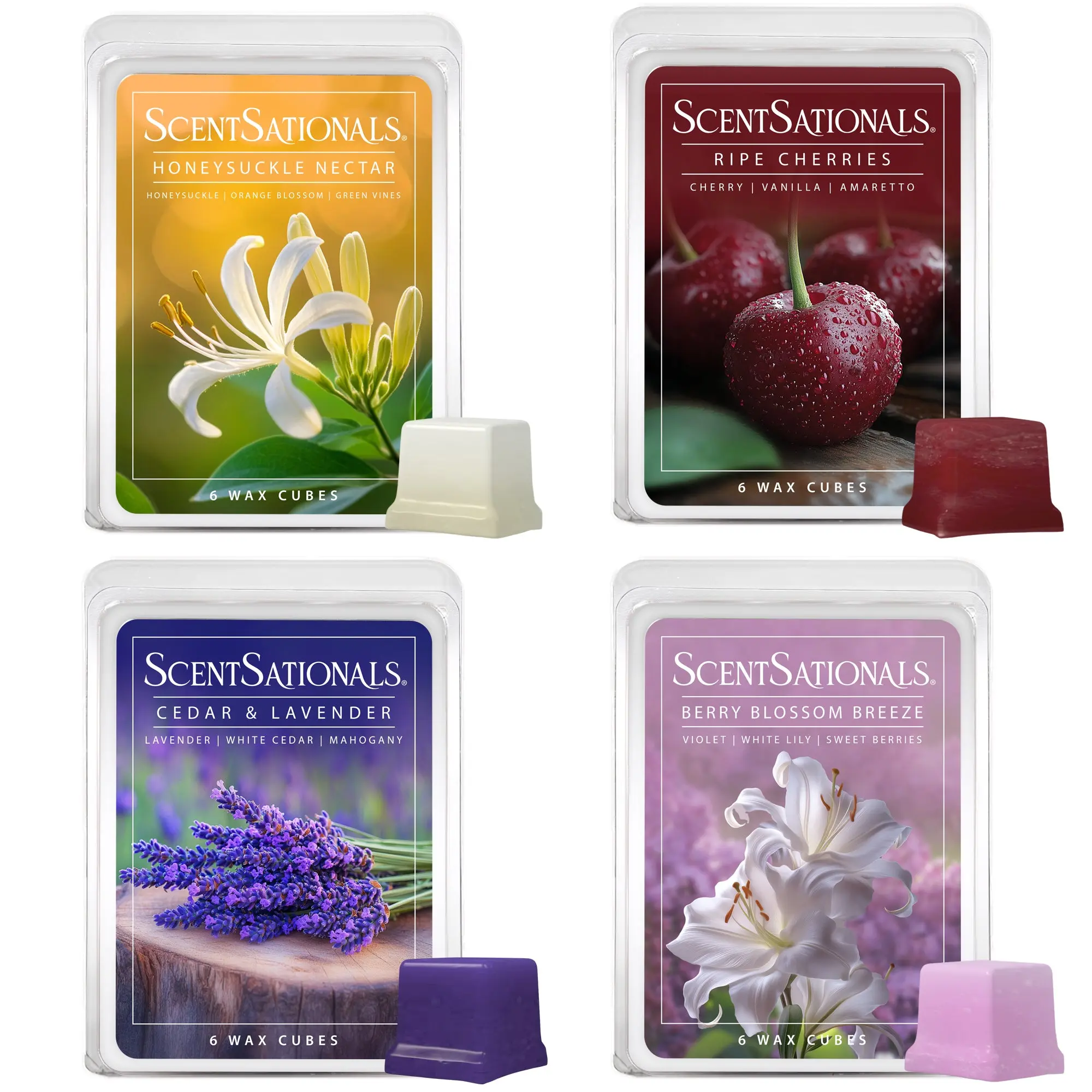 ·Curated 4-Pack of Scented Wax Melts – This set includes four distinct fragrances: Cedar & Lavender, Honeysuckle Nectar, Berry Blossom Breeze, and Ripe Cherries, offering a nature-inspired blend that evokes a fresh, floral, and fruity ambiance perfect for any season.