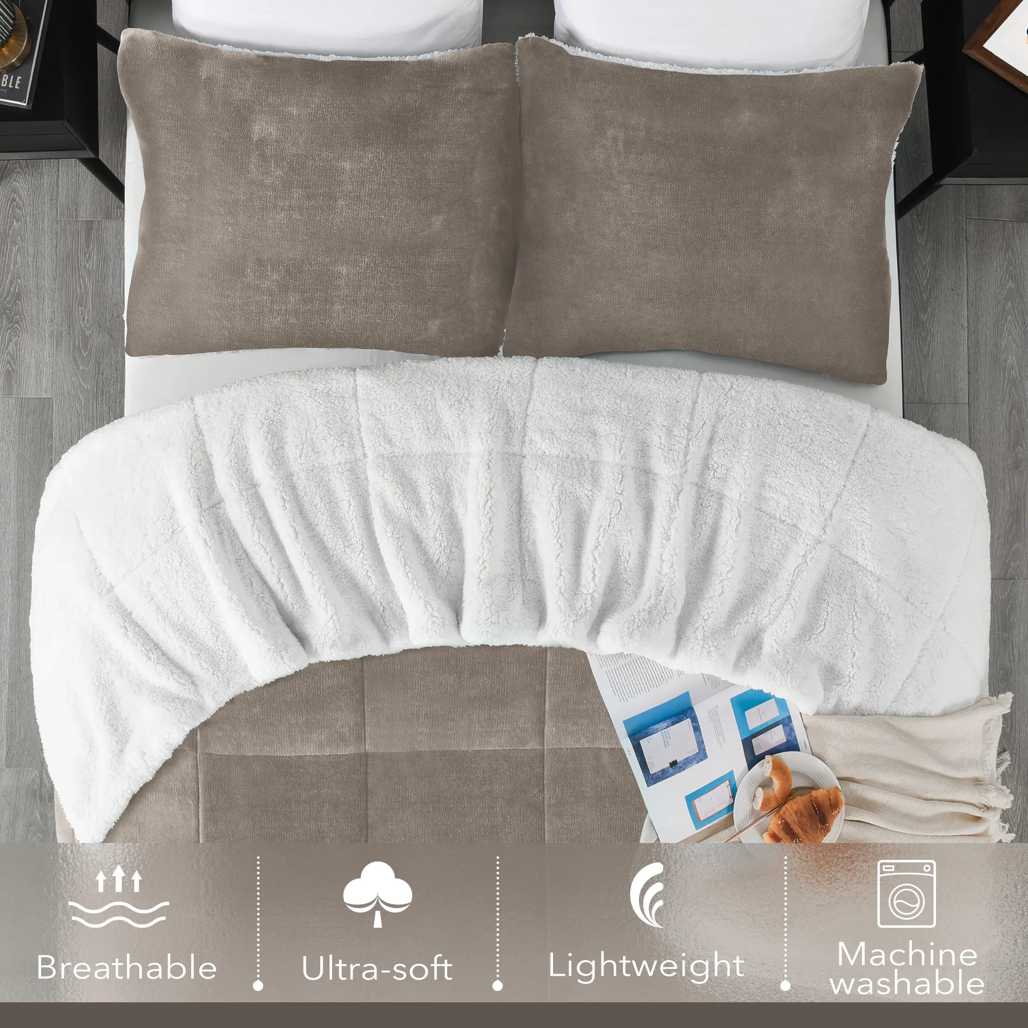 Premium Material: One side of the queen bed comforter set is made of micromink, and the other side is made of sherpa. The cloud-like soft bedding set will always keep you warm in cold weather's night and let you have a high-quality sleep.