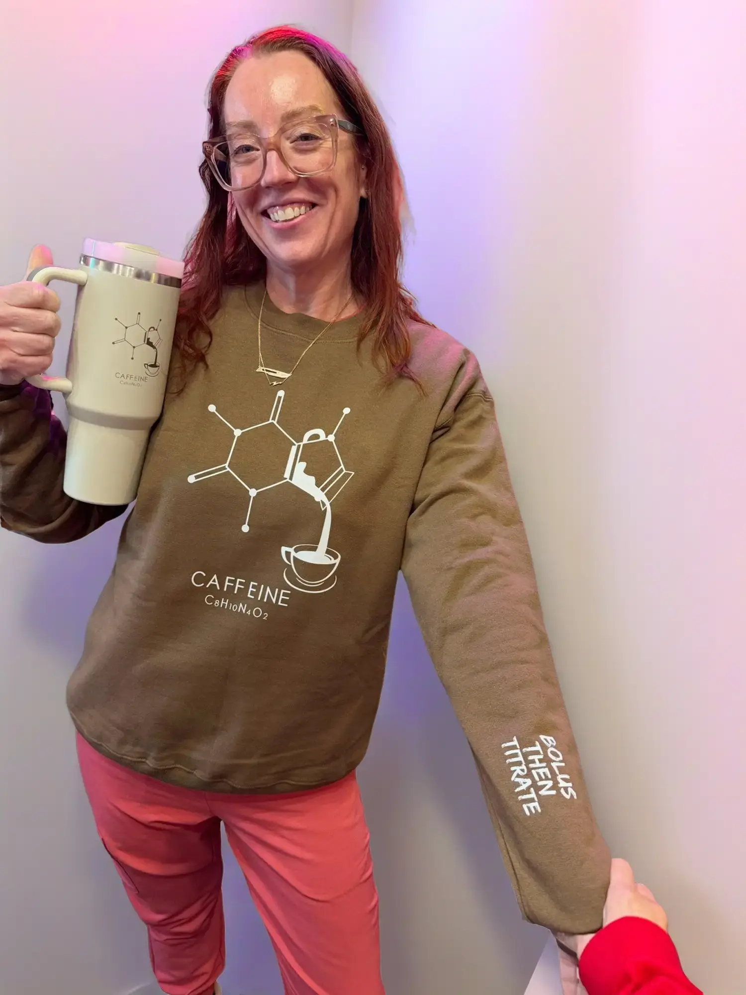 This cozy crewneck is a must-have for healthcare pros and coffee lovers. Featuring a clever caffeine molecule design (C₈H₁₀N₄O₂) shaped like a carafe pouring coffee into a cup, it’s the perfect way to rep your caffeine obsession. Plus, the left sleeve says "BOLUS THEN TITRATE" ...because caffeine dosing is serious business!